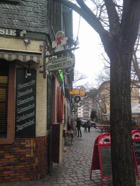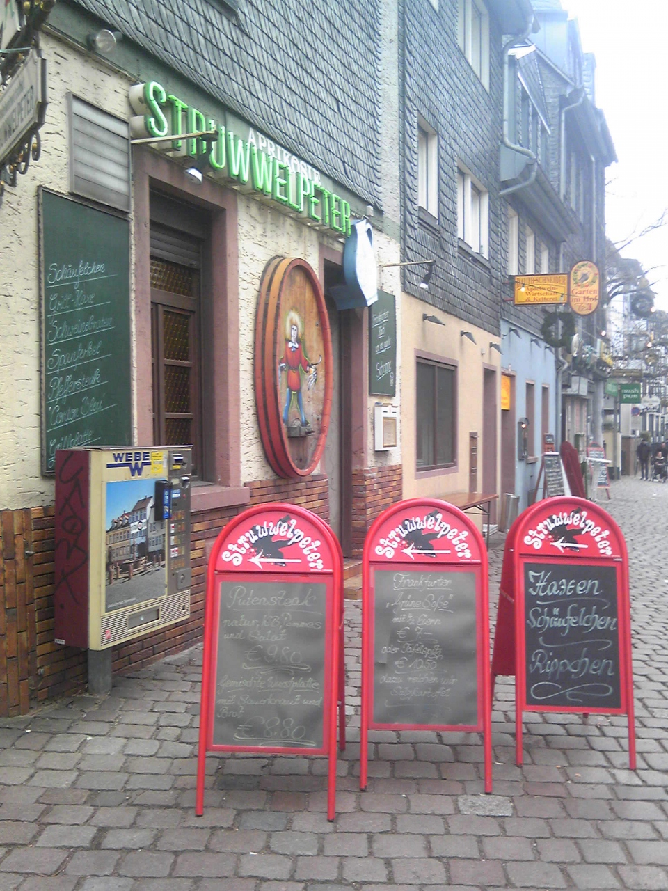 ハノーバーの出張から帰国する際に、フランクフルトでの乗り継ぎが13時間以上、と言うチケットしか取れなかったもので、気持ちを前向きに切り替えて、「フランクフルトにも寄れて、ラッキー!」と思うことにして、空港から市内の観光地に出かけました。まずは、レーマー広場周辺を散策して、遅いお昼はザクセンハウゼンとか言うところが有名らしい、と向かったのですが。。。 日曜の昼には、どーこも開いてないんですな、これが。 と言うことで、歩き回っているうちに偶然見つけたお店がこちらです。帰ってきてWeb見てみたら、何か、歴史のあるお店のようなそうでもないような。