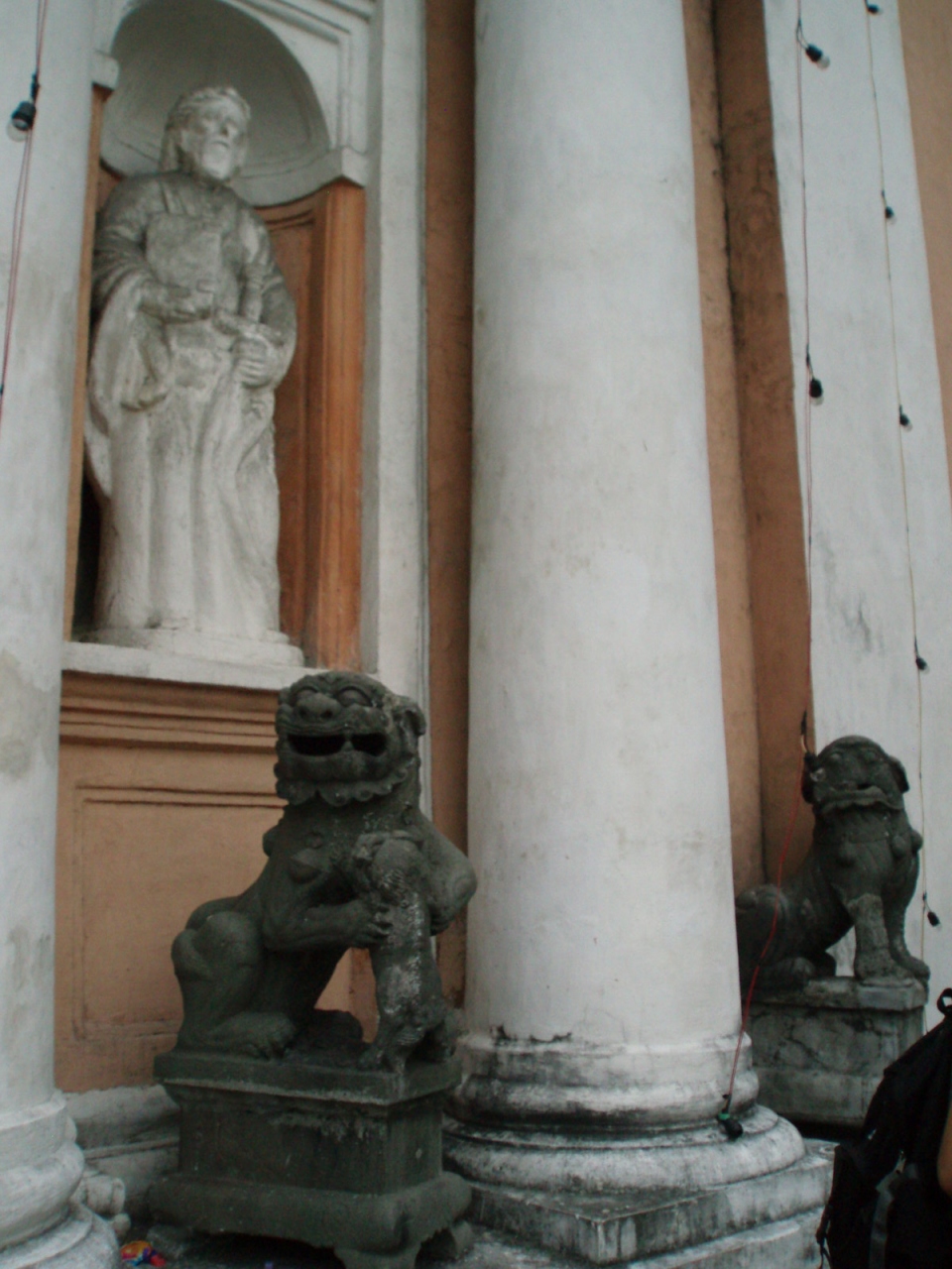 教会の入り口に狛犬?みたいな動物の彫刻が設置されている所にアジア文化とカトリックの融合を垣間見れます。