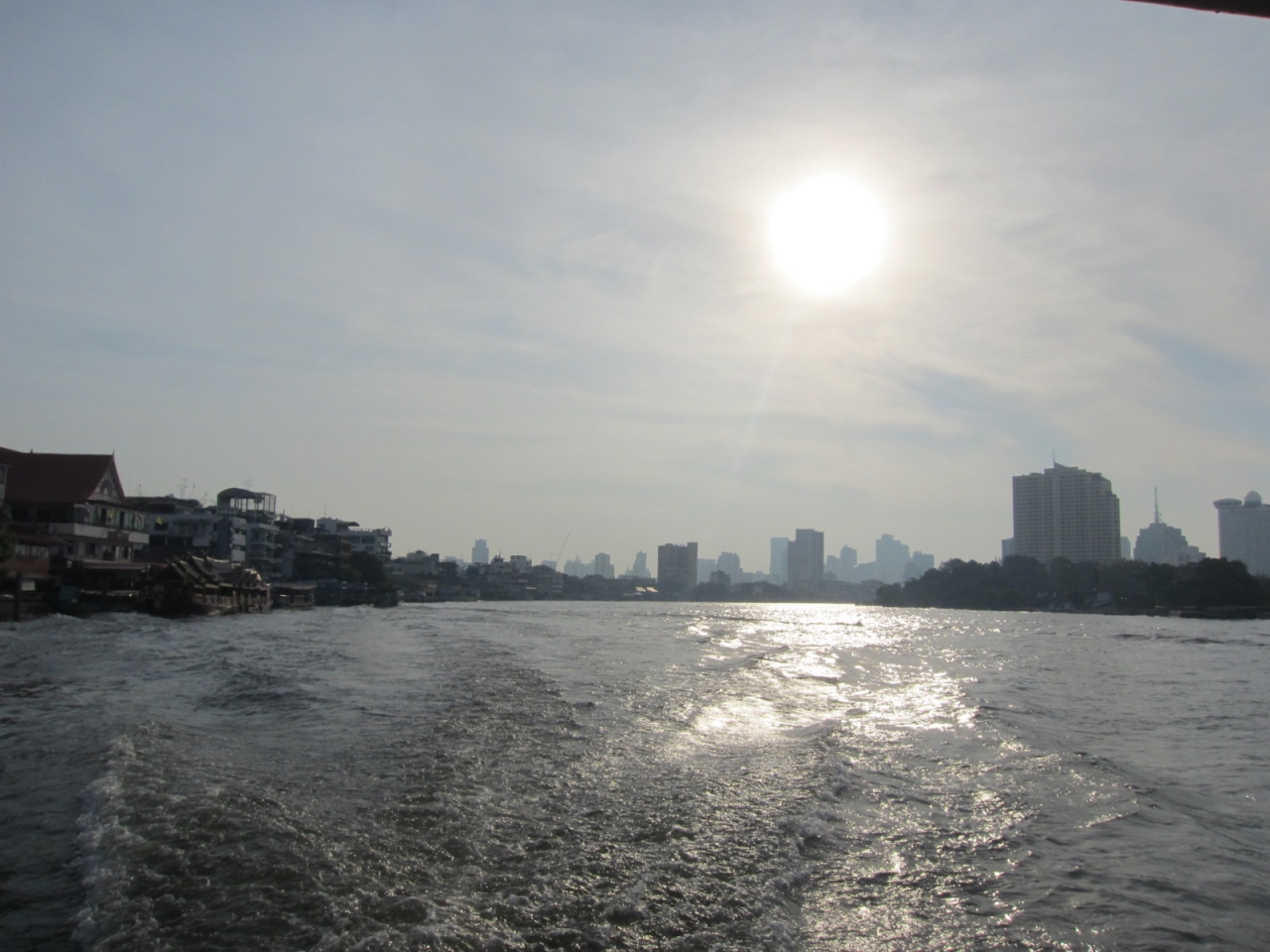 私は移動手段でチャオプラヤーエクスプレスに乗ってチャオプラヤー川を通りました。川はきれいじゃなさそうですが、日差しでキラキラきれいです。