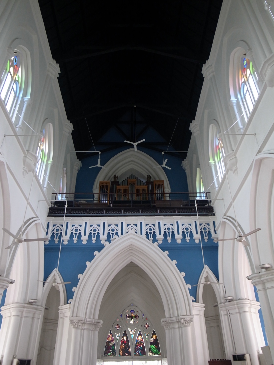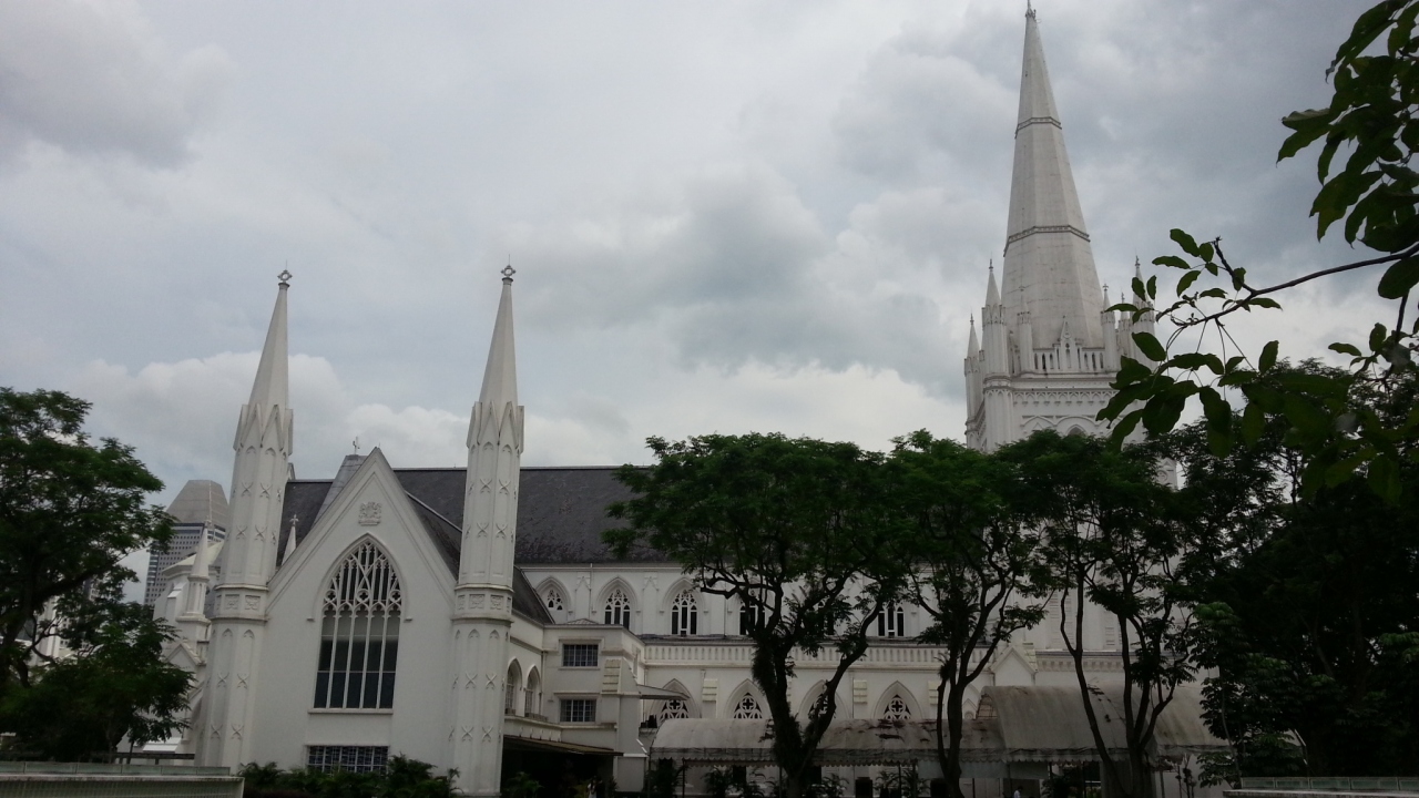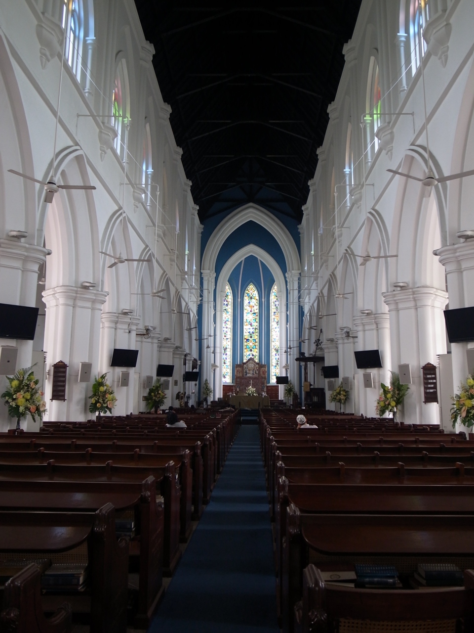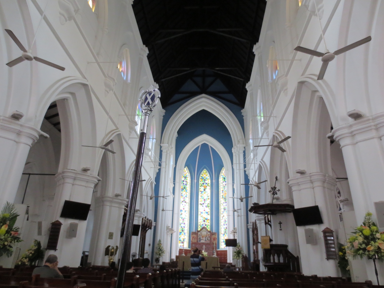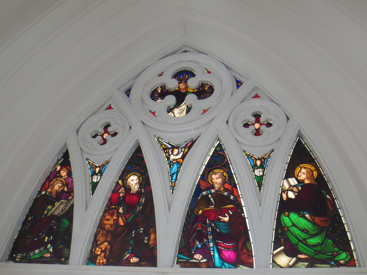 外観は純白のきれいな白い建物。内部はステンドグラスが美しい神秘的な空間です。
