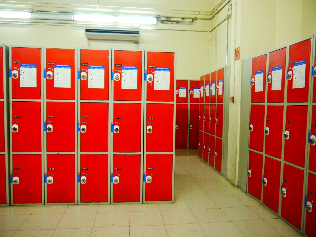 パスポートを提示して料金を払い、荷物検査を受けた後、階段を下りて自分でロッカーまで運びました(回収時も同じ)。