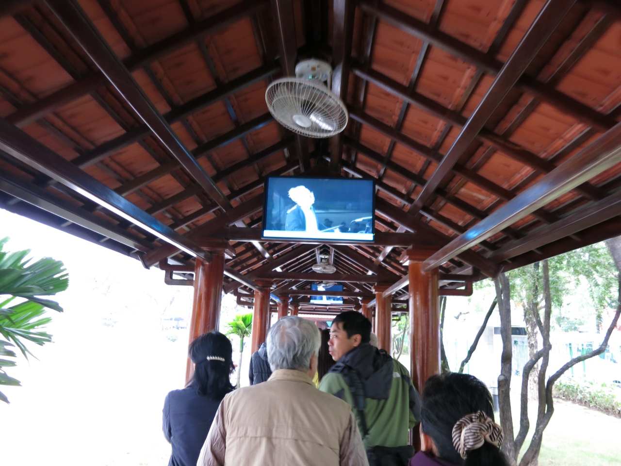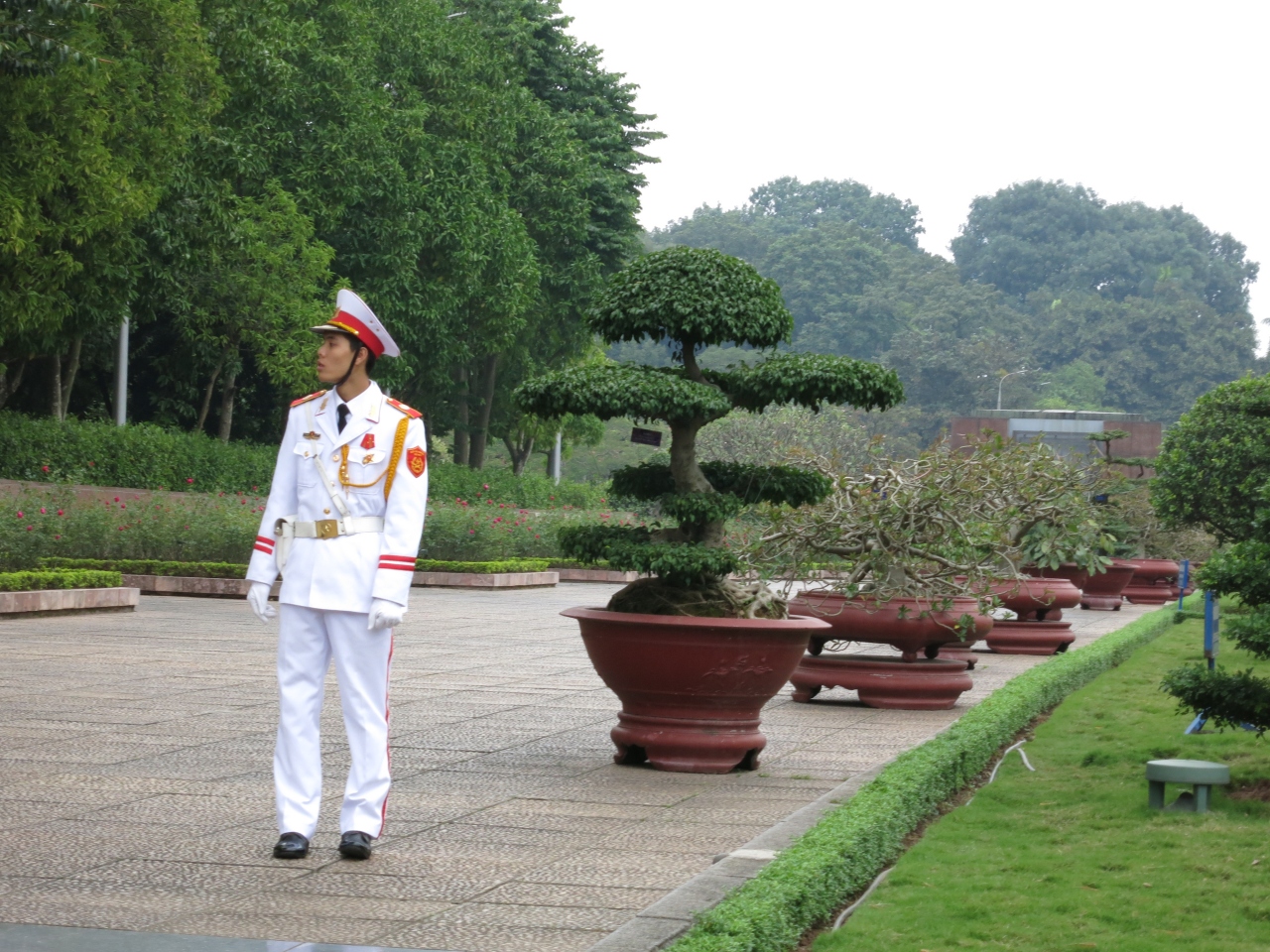 ホーチミンさんかわいそうですね。でも、きれいに安置されていました。列を作って並びますが、建物に入る前から、私語や写真は禁止です。立ち止まることはできませんので、昔の上野のパンダの見学みたい。(不謹慎で済みません)見終わった後、広場から撮影するのは怒られません。軍隊や警察がたくさん研修できているのでしょうか?記念撮影していました。