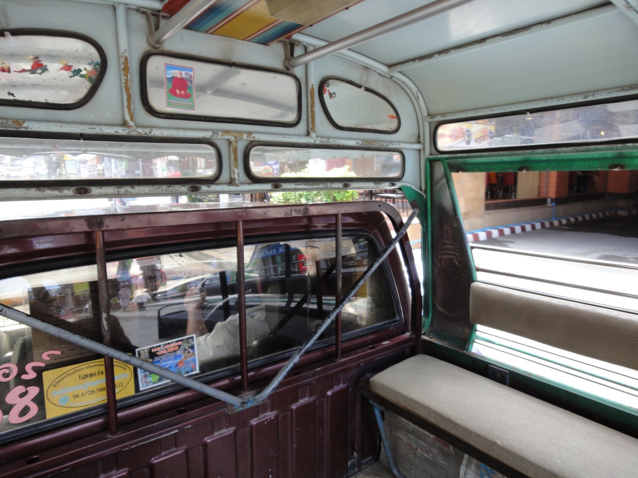チャウエンロードを走っています。一人20バーツですが、値段交渉は必ず乗る前にしないといけません。一度交渉せずに乗ったら200バーツとぼったくられそうになりました。運転手によっては日本人相手には一人100バーツとはじめから言ってくるひともいるため注意必要です。降りるときは紐をひき鐘で鳴らして降ります。いつでもどこにでもいるので便利です。