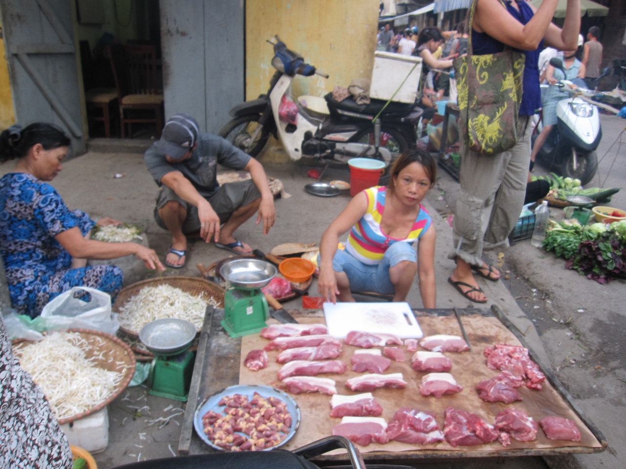 バイクと人ごみと露店でゴチャゴチャしてます。食料が何でもむき出しになってレジャーシートに陳列してあるのにはビックリしました。生肉もドンと置いてあります。衛生面が気になります。そこら中で、自転車にフランスパンを乗せて売っています。もちろんむき出しで・・・日本のふんわりしたパンとは違いますが美味しいです!!