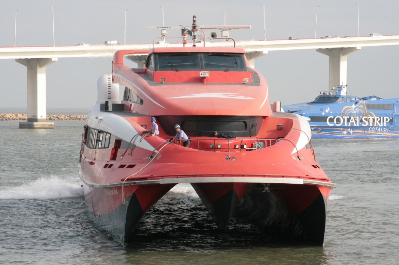 11月中旬に団体旅行で香港を訪れたのですが、このフェリーのおかげで自由時間にマカオへ気軽に行くことができました。香港・マカオ間を1時間で結び、24時間運航のため夜まで香港で飲食後、深夜にマカオを訪れカジノへ行くといったちょっと無理なスケジュールを組めました。週末だったせいかエコノミー席は夜12時でも混んでいましたが。