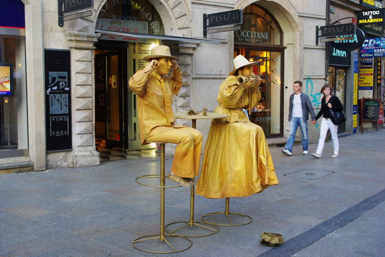 クラクフ旧市街の真ん中に位置するだけあって、人が多いですが、それに比例していろんなパフォーマーがいるので、賑やかで楽しいですよ。多いのが全く動かない人。お金をいれると動いたりします。