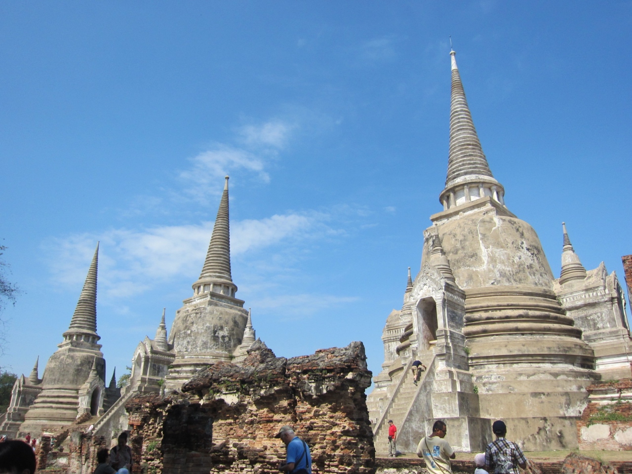 古都アユタヤはビルマとの戦争で破壊され、廃墟となってしまっっていますが、有名な菩提樹に囲まれた仏頭があったり、青空と緑と遺跡がとてもきれいでした。