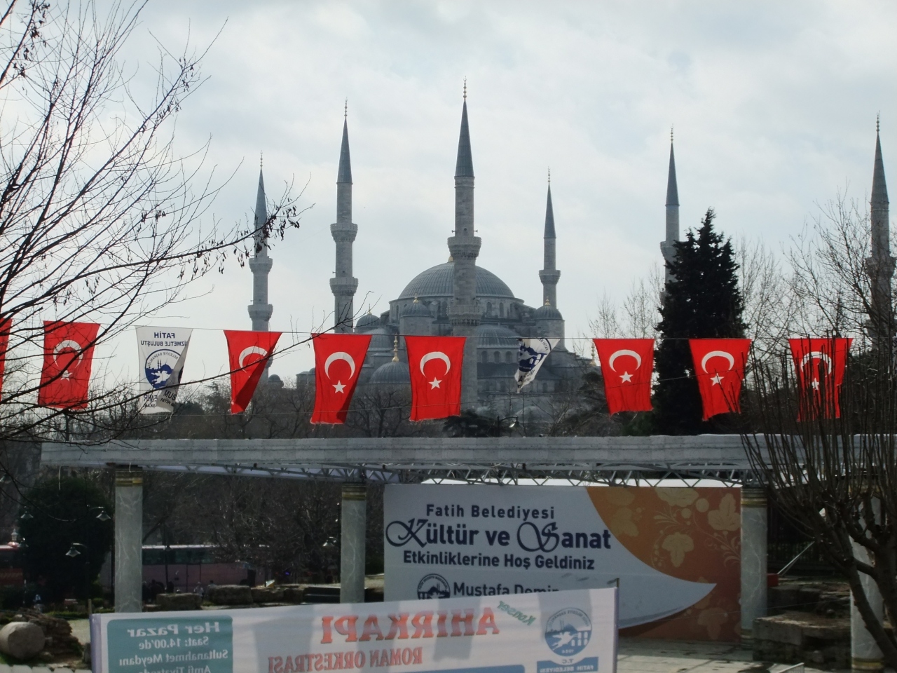 イスタンブルといえばブルーモスクということで見学に行きました。周辺は日本語を巧みに話す兄ちゃんたちがうろうろしています。案内してあげるとめちゃくちゃフレンドリーです。高額な絨毯を買わせられるとおもいひたすら無視しました。モスク内は土足厳禁であるので靴を脱いで入ります。ガラス絵等が綺麗で感動モノでした。
