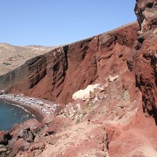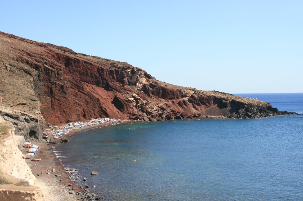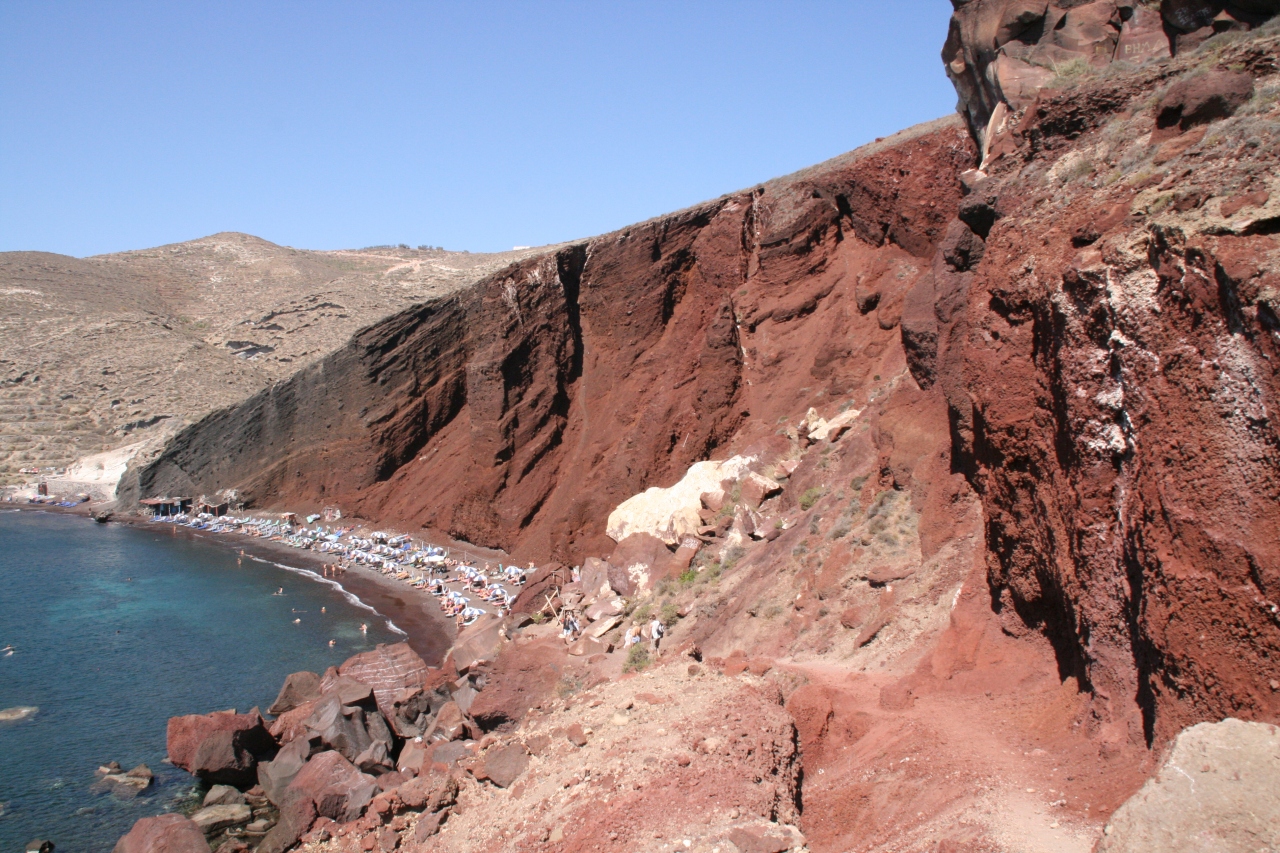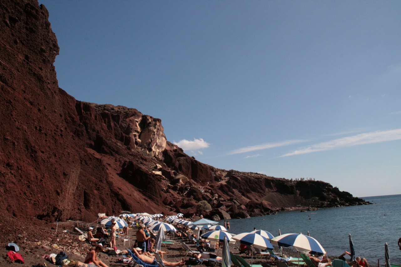 アティニオス港から島内の各ホテルへの送迎バスのガイドをしていた方から勧められたビーチです。フィラのバスターミナルから終点の駅まで30分少し乗車し、その後少し歩きました。訪れてみるとその名の通り赤い崖を背景にビーチが広がっており、多くの海水浴・日光浴を楽しむ観光客で賑わっていました。