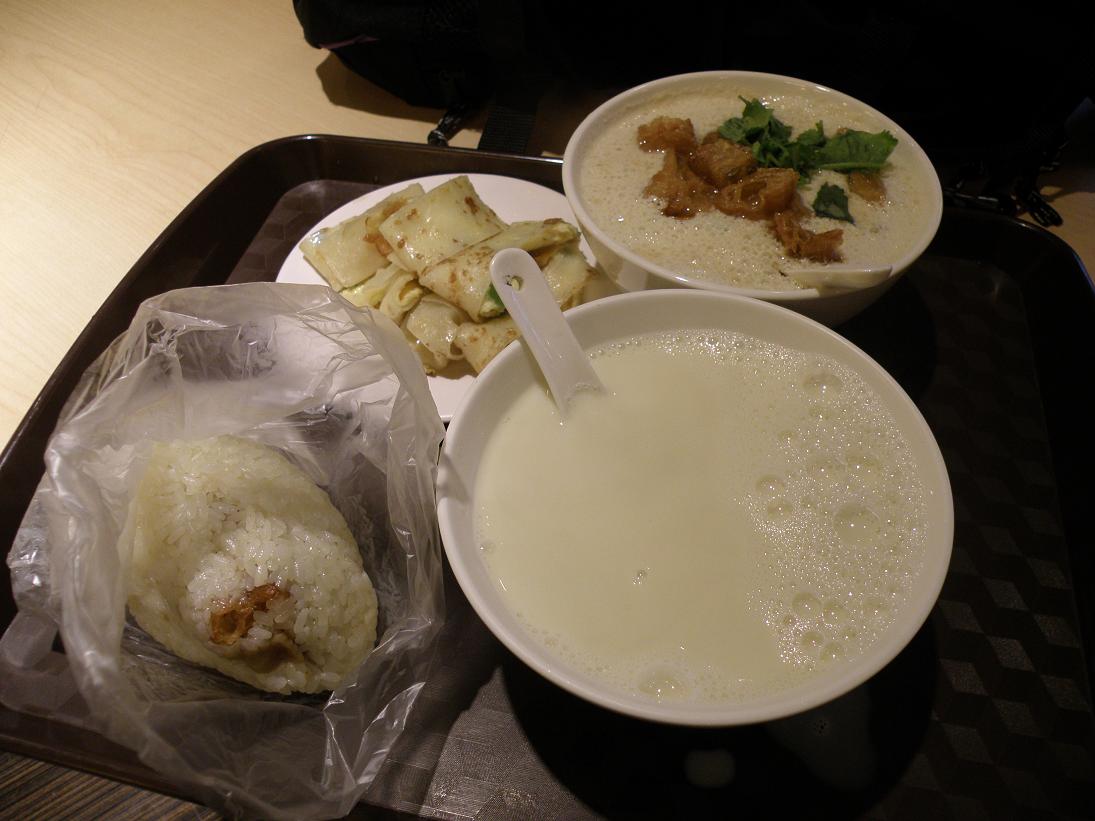 地元の人も多いが、ガイドに連れられて、やって来た観光客も見かける。今や、台北の朝の名所。豆乳、味つき(醤油味)の豆乳、現地風のパン(焼いているのが列から見える)、もち米のおにぎり(具いり)、台湾風クレープ、そのあたりを想定して列に並べば、あとはカウンターで日本語メニューをみせてもらえるから、即決すればいい。1品30元前後で、2人でも150元で十分だ。2人で行くなら、違った味の豆乳を試して見よう。フードコートのように、多くの席があるので、混雑していても十分座れます。地下鉄駅の善導寺の5番出口を出た「花山市場」の2階です。さすがに入り口では、えっ、こんなところなのと思ってしまうが、ご心配なく。