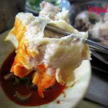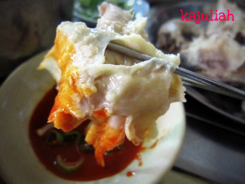塩を付けたり、赤いタレにつけて食べました。