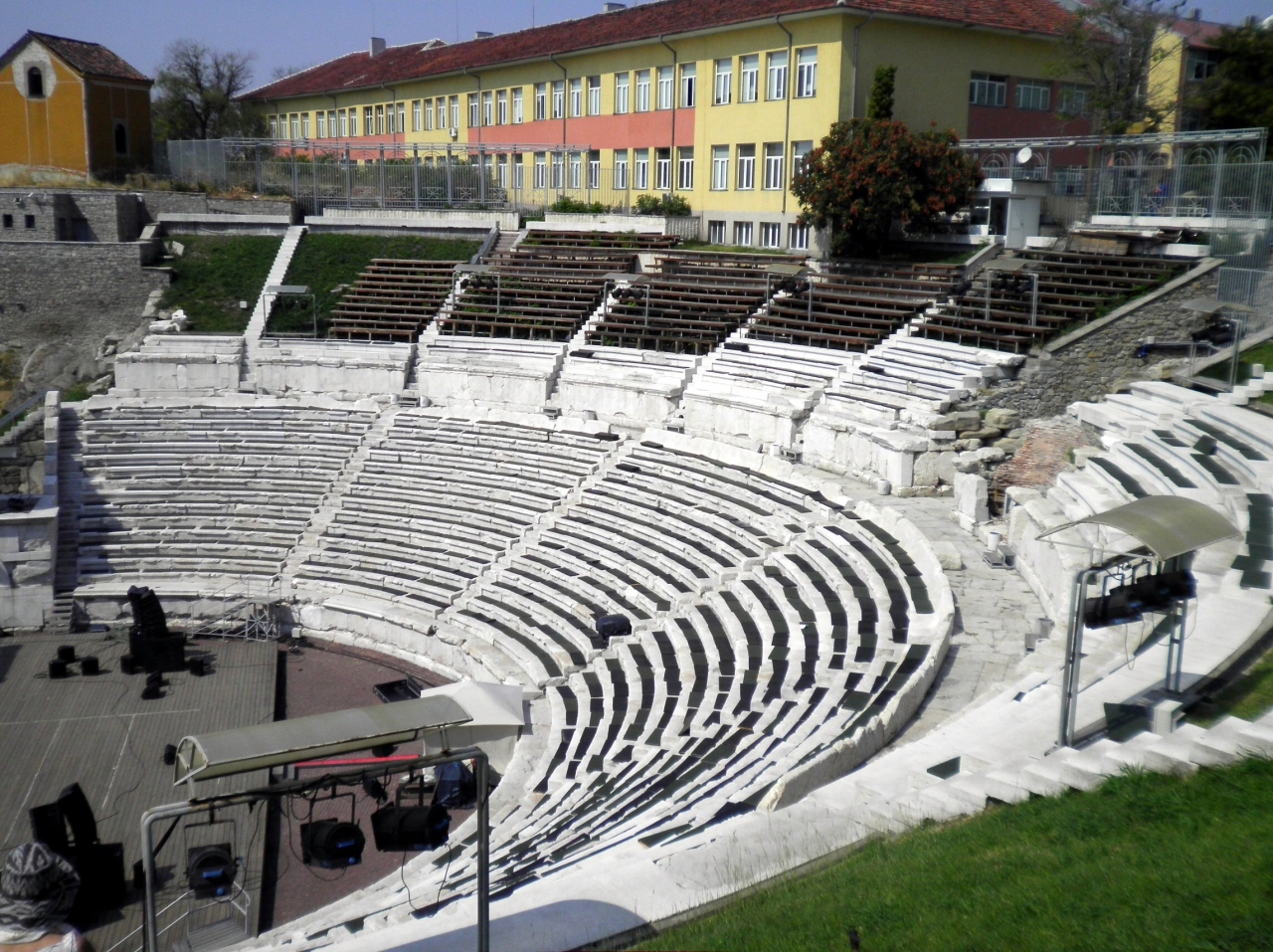 丘の上に残る円形劇場は今も野外コンサートなどに使われる。