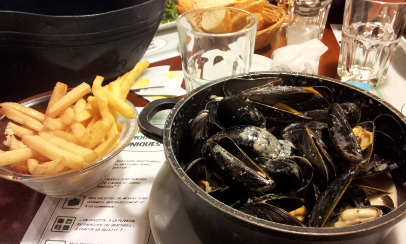 滞在中2回行きました。1日目にしてフランス料理に食傷気味になり、二日目からはフランス料理以外の食事を家族みんなが希望。夫が魚介類好きなのでムール貝で有名なレオンへ。最初はでレオン味!?のムール貝のココット、サーモンのセット前菜のセットとビールで50ユーロくらい。2回目はペッパー味のココットとムール貝のパスタ、サーモンのセットビールで60ユーロくらい。フランスパンとフライドポテトが付いてきます。二回目は前菜にサラダをチョイスしました。でもポテトは付いてきたのでサービスなのかしら。量が多いのでシェアしようと思ってましたが、人数分の何かしらの料理のオーダーを勧められます。ココットはどちらの味も美味しかったです。日本で食べるムール貝より小粒ですが、匂いもなくて美味しいです。お腹があまり空いていなかったのですが、ひと鍋いけました。パスタも量が多いです。日本からしたら高いけど、パリでの食事と考えればお安く感じてしまいます。