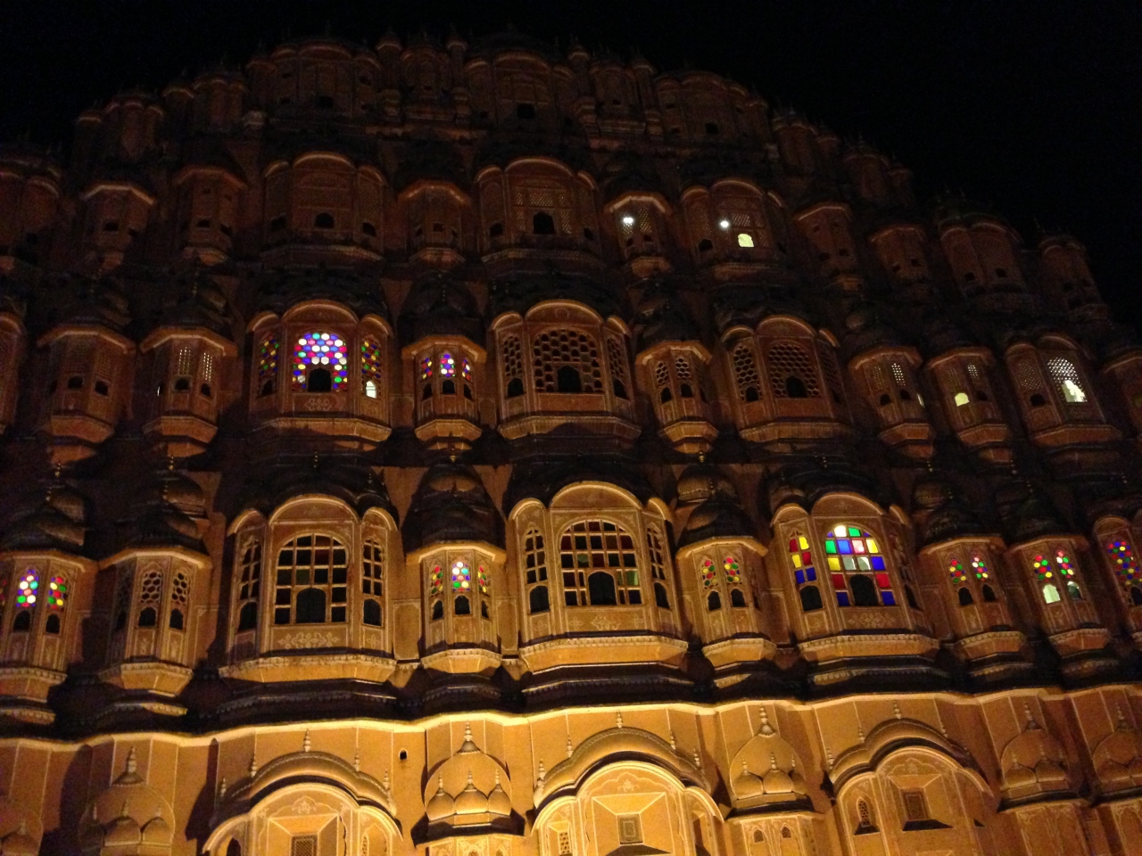ピンクシティなので、陽が当たる時間に見るのがキレイですが、ハワーマハルは夜もオススメです。ステンドグラスの明かりがとてもキレイですよ! 夜になると足元がぐっと見えにくくなりますので、牛のふんには十分気をつけてください。