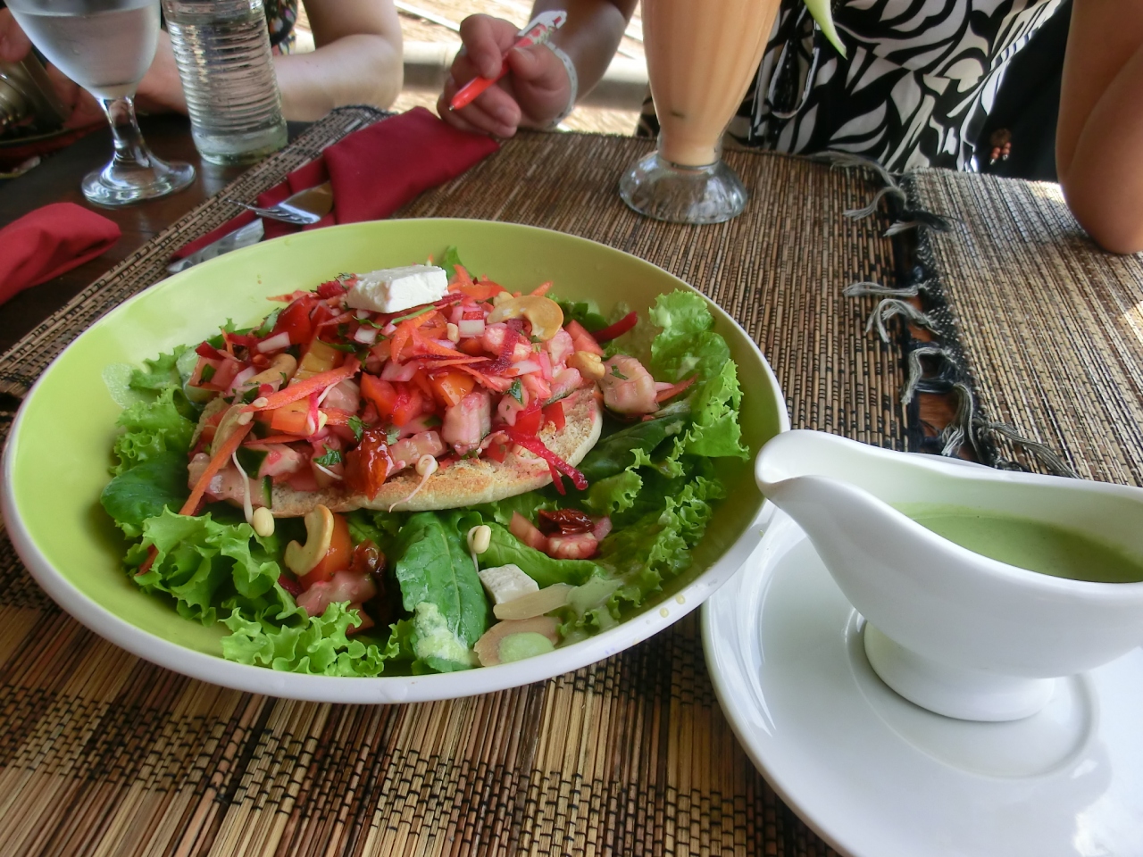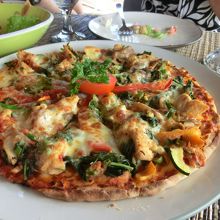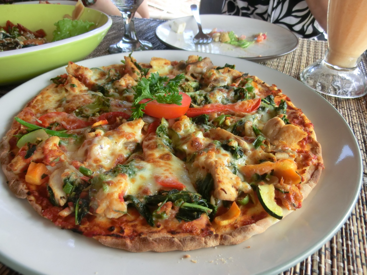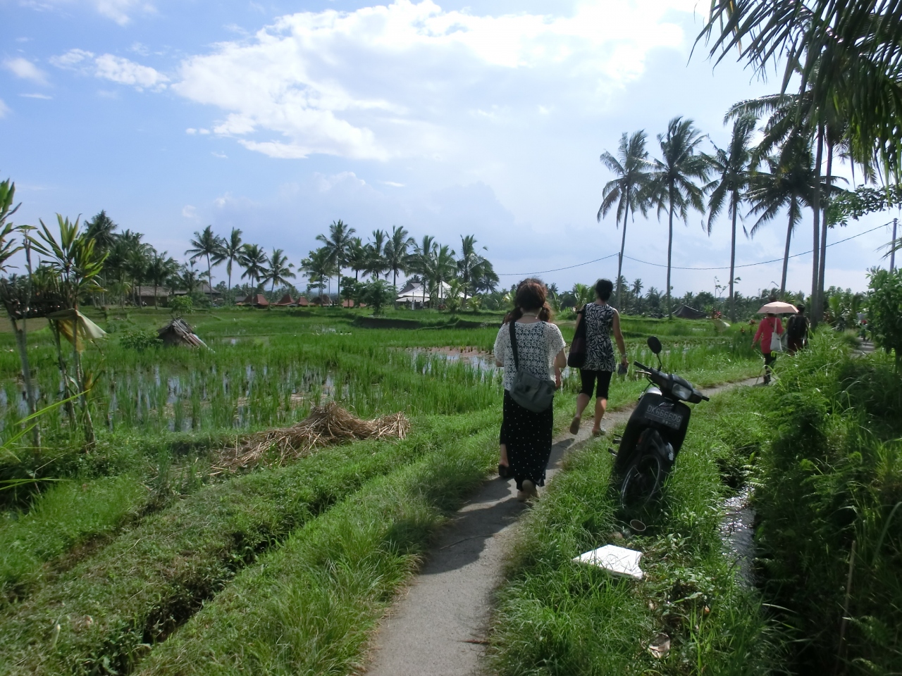 田んぼのあぜ道を汗かきかき歩いたあとのフレッシュジュースの美味しいこと!竹のストローがまたいい。心地よい風をうけながらいただくお野菜たっぷりピザは野菜嫌いな娘もペロリ!焼き野菜サラダもおすすめです。ワルンに比べればかなり高い値段ですが、満足できるお味です。このレストランつながる道の途中にあるCantika Spaもお薦めします。ここ2~3年であぜ道の景色が変わってきたことは少し残念。
