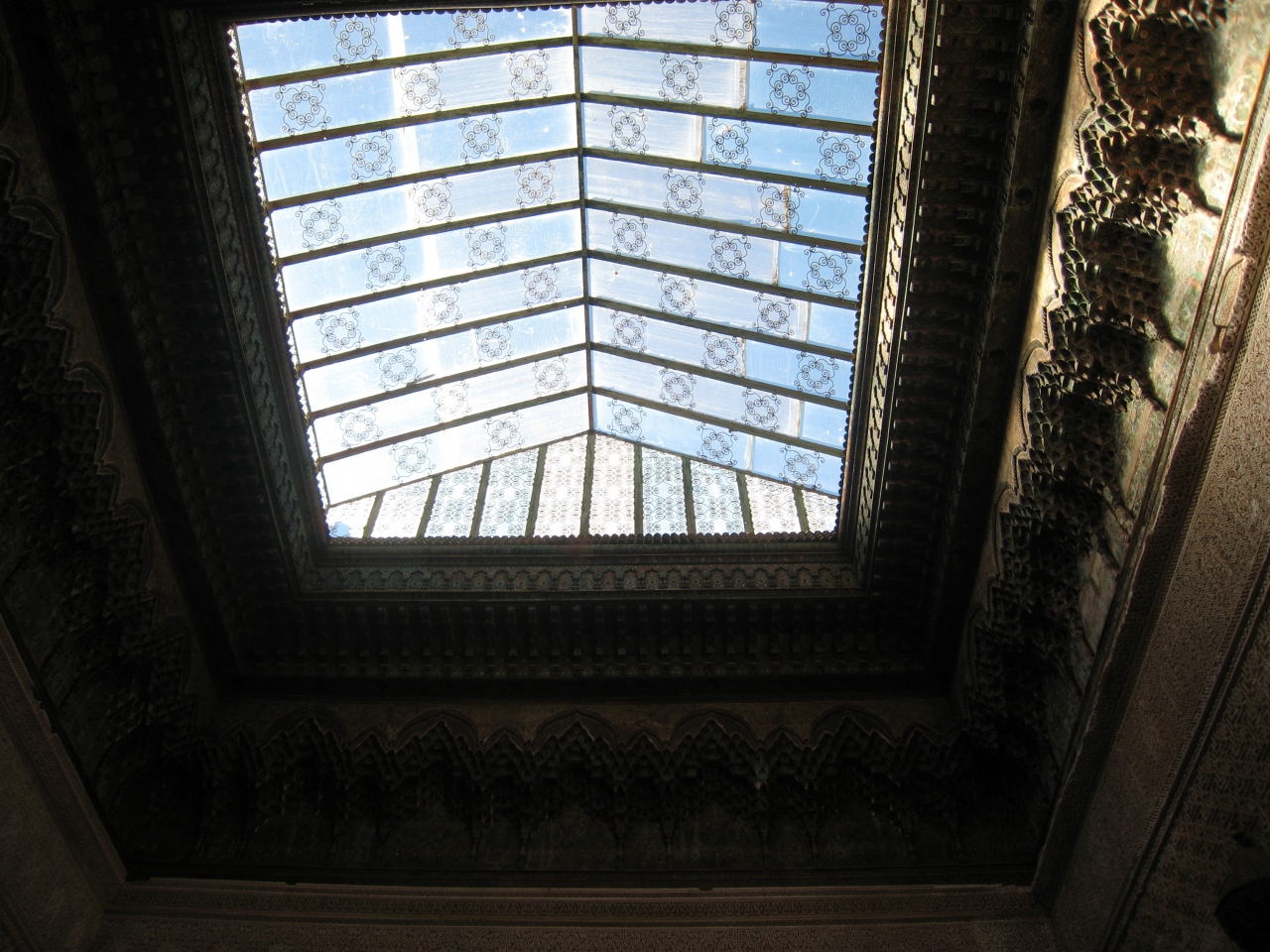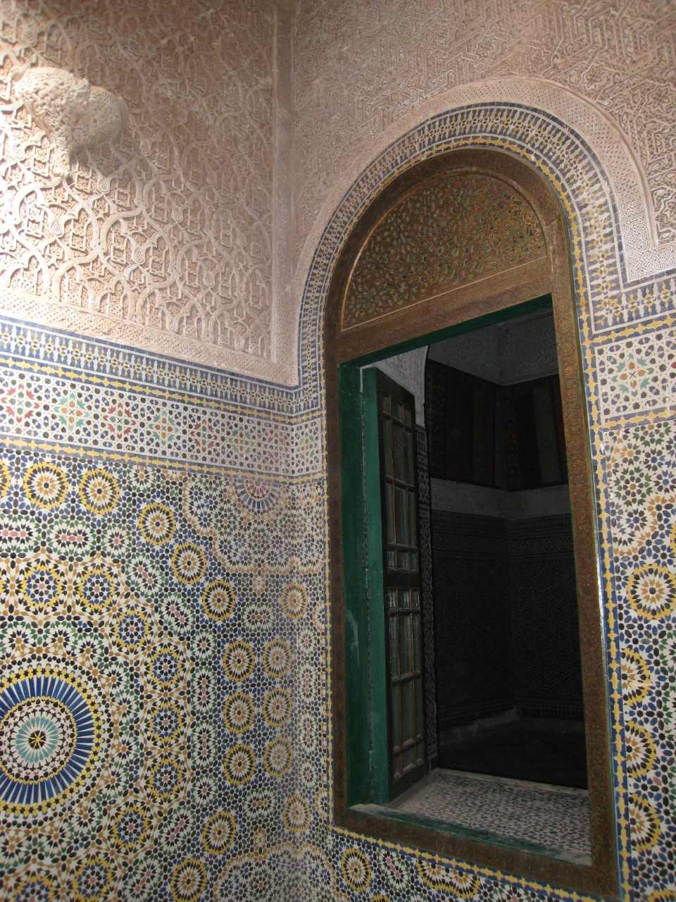 アトラス杉から作られ繊細な彫刻を施した扉、モザイクタイルが作り出す不思議な空間、そして布を通した柔らかい光が優しく照らし出す執務室、5人の妻と81人の女性が暮らした部屋の窓から見える村の風景、どれをとってもマラケシュの宮殿とも引けを取らない優雅さ。