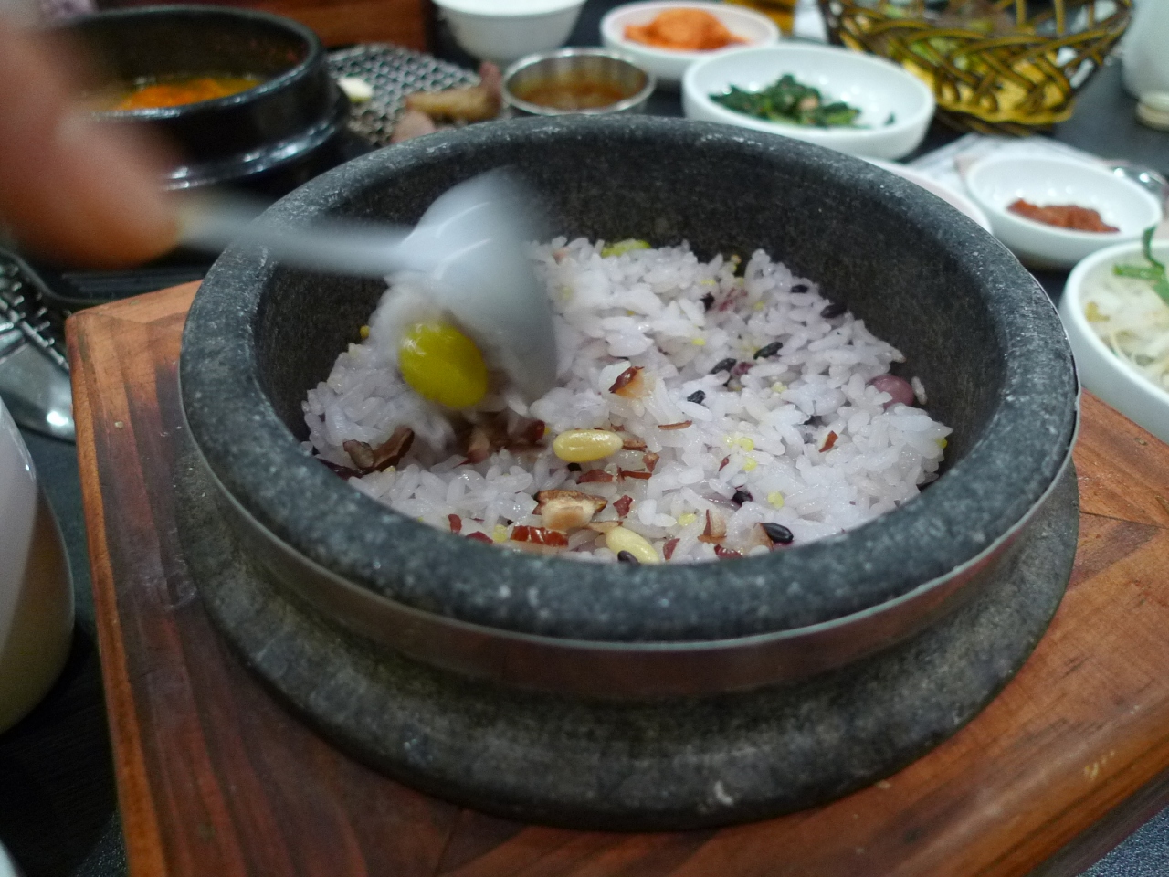 ランチは定食1人前13000wで味噌チゲ付き。ご飯か麺か選べ、早くご飯が食べたいと思い催促してもなかなか来ないと思ったら、ご飯は釜飯でした。お肉は分厚くて、お店の人が焼いてくれます。もう少しお肉食べたいかなとも思いましたが、食べ歩きするには丁度いい量かも。
