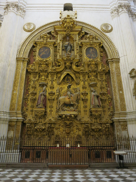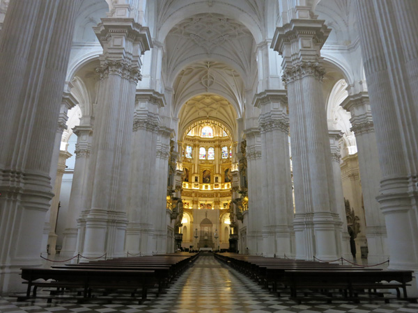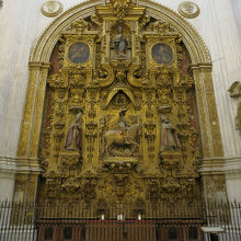 基本的にはルネサンス様式の建物でしょうか。内部は、真っ白でしっかりとしたコリント式の複合柱が立ち並びますが、天井にはゴシック的リブ装飾があります。主祭壇は解体修理中でしたが、金で縁取られ、ステンドグラスと絵画で飾られた豪華ですっきりとした空間になっています。パイプオルガンも見事。