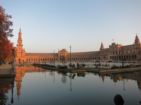 半円弧状の美しい建物が取り囲む広場で、80年ほど前の博覧会のパビリオンとして立てられたそうです。建物に添って、スペイン各県の出来事などを描いたタイル絵のベンチが配されているほか、カスティーリャ、レオン、カタルーニャ、ナバラの旧4国の紋章が書かれたゲートと橋がそれぞれあり、スペイン全土を示しています。噴水も美しい広場です。