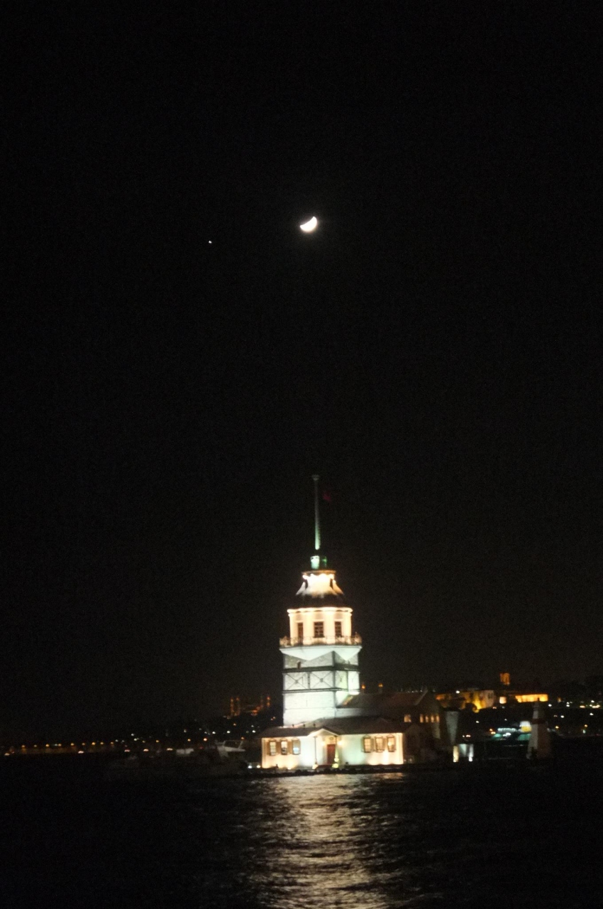 乙女の塔とその頭上に輝く月。