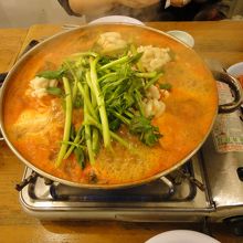 鍋には白子がゴロゴロゴロゴロと、辛そーなスープにたくさん入ってます。