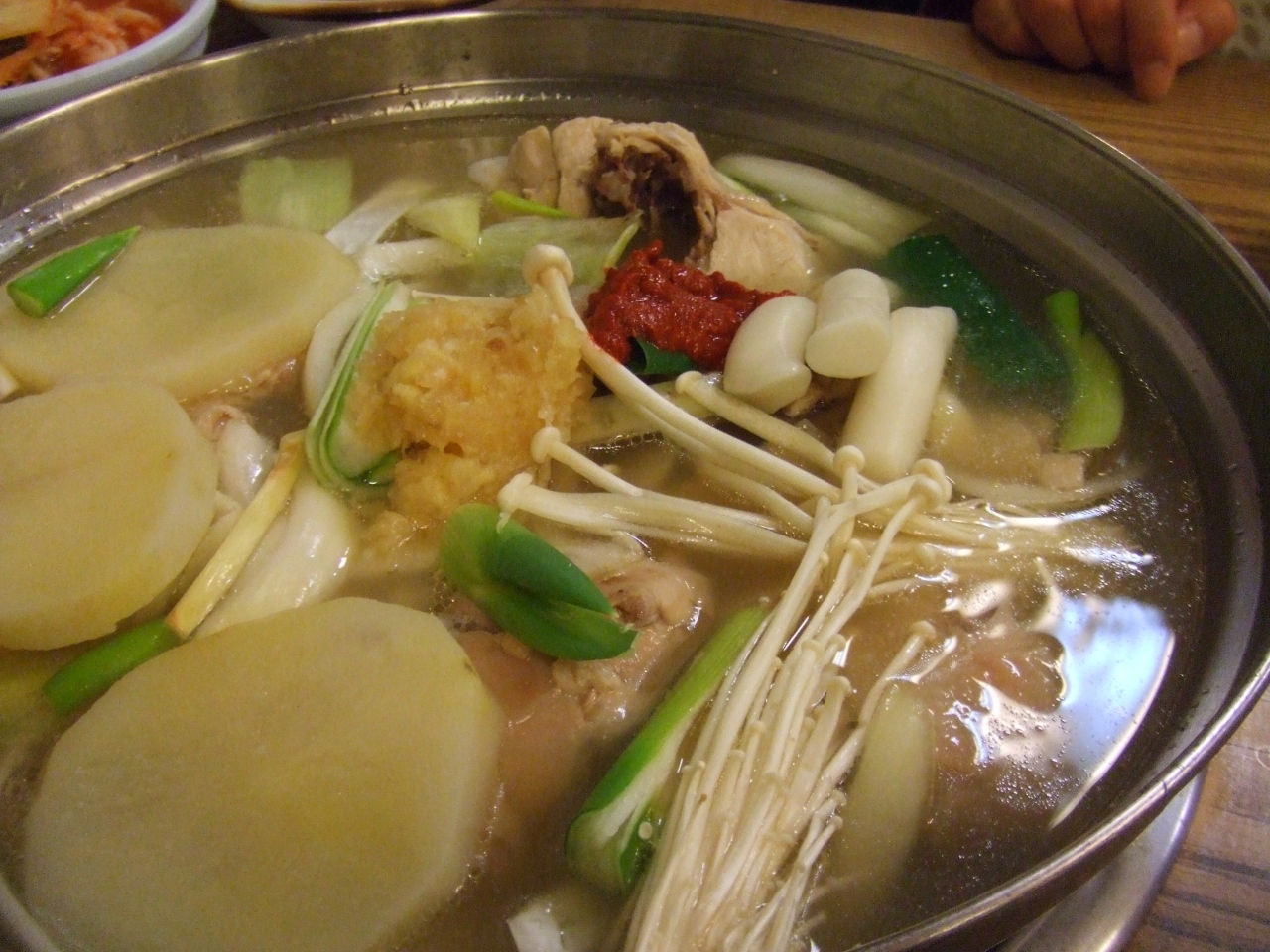 一般的にタッカンマリというと辛くない薄味のスープに鳥一羽がまるまる入っているイメージですが、こちらのお店のスープは最初からヤンニョムが入ったピリ辛タイプ。