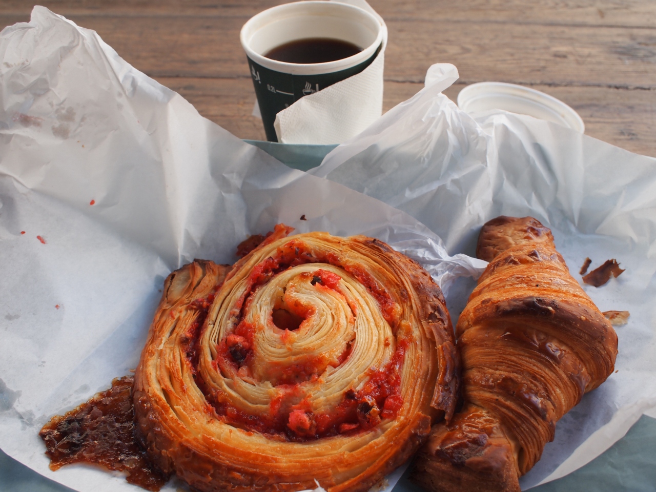 外にテーブルがあったので、そこで食べて良いか聞くとOKとのこと。飲み物は売っていなかったので、コーヒーをどこで買えるか聞いたら「あっちの方に歩いていけばお店があると思う」と方角を教えてもらったのですが、結局見つけられずに(方向音痴なので正しい方向に歩いたか不明です)レピュブリック駅の近くにあるファーストフード店でコーヒーを買って戻りました。お店で食べたい方は予め飲み物を買っていくと良いと思います。