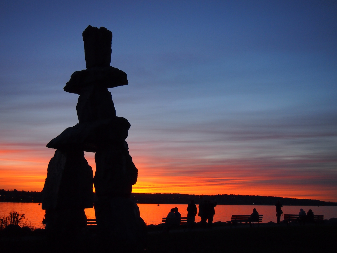 この場所のオススメは、夕暮れ時です。 晴れていれば、素晴らしい夕焼けがのぞめます! バンクーバーオリンピックのロゴマークとしても使われた、イヌクシュク(石像)も、このEnglish Bayにたてられていて、観光スポットになっています。 特に狙ってこの時間帯に行ったわけではないのですが、ちょうど夕焼けがキレイな時間帯で、この旅行全体で1番お気に入りの写真が撮れました!