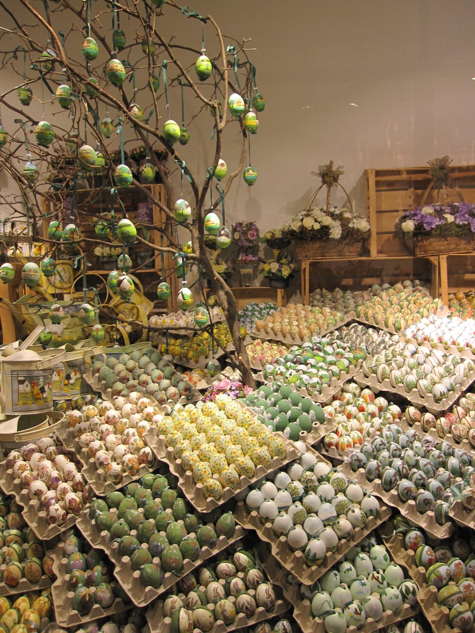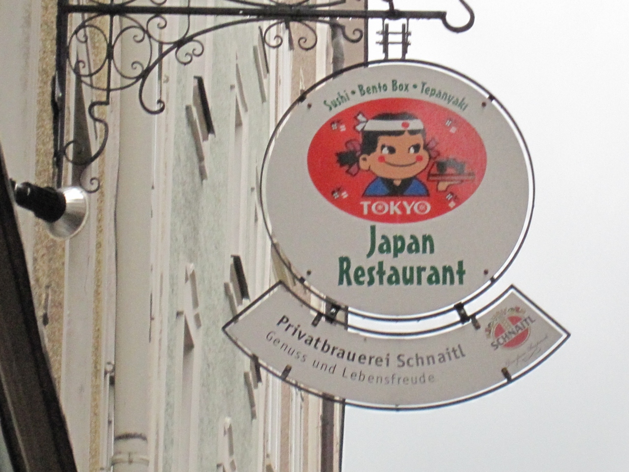 看板がオシャレな通りです。ショップは飲食店やオーストリアグッツのお土産屋さん、卵のクリスマスオーナメントなどがあり女性ならゆっくり見ていてたい思うとお店だらけでした。オシャレな看板の中にはペコちゃんの看板もありました。