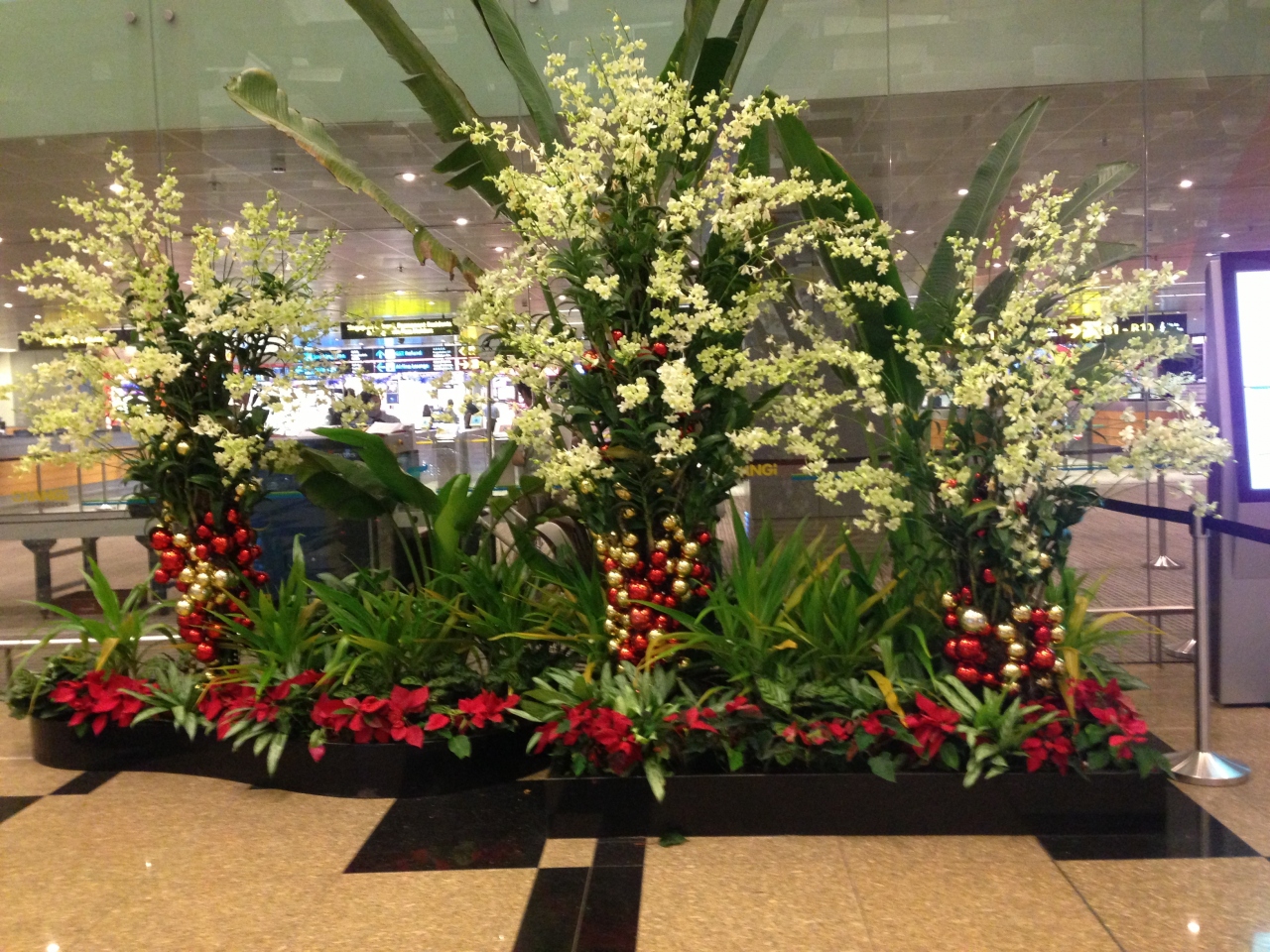 中は新しく、地震がないからか、柱があまり無く広々していました。蘭が有名な事もあり、生花の蘭で飾られたXmas装飾や、チャイニーズの装飾がありました。ターミナル3には、ちょっとした植物園もありました。トランジットの方にも退屈させない気配りを感じました。真夜中でもレストランに行列ができていたり、食事をしている人たちも結構いました。