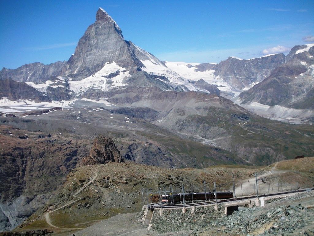 ツェルマット中央駅の真ん前にある、ゴルナーグラート登山鉄道駅から40分ほどでゴルナーグラート駅に到着。1898年に開業したこの鉄道、駅舎も趣があります。駅の傍には展望台とホテルがあり、ヴァリス山群の素晴らしい氷河が眺められます。極めつけはマッターホルンの眺望、ここからのハイキングは最高です。