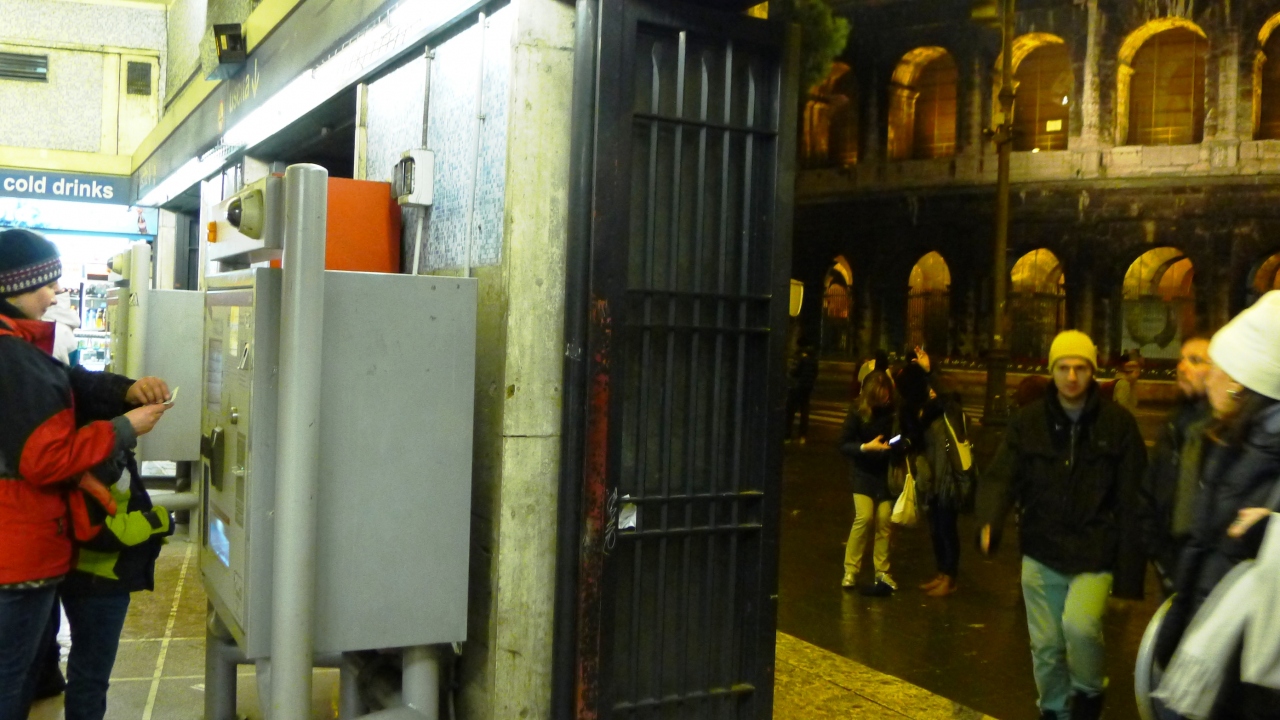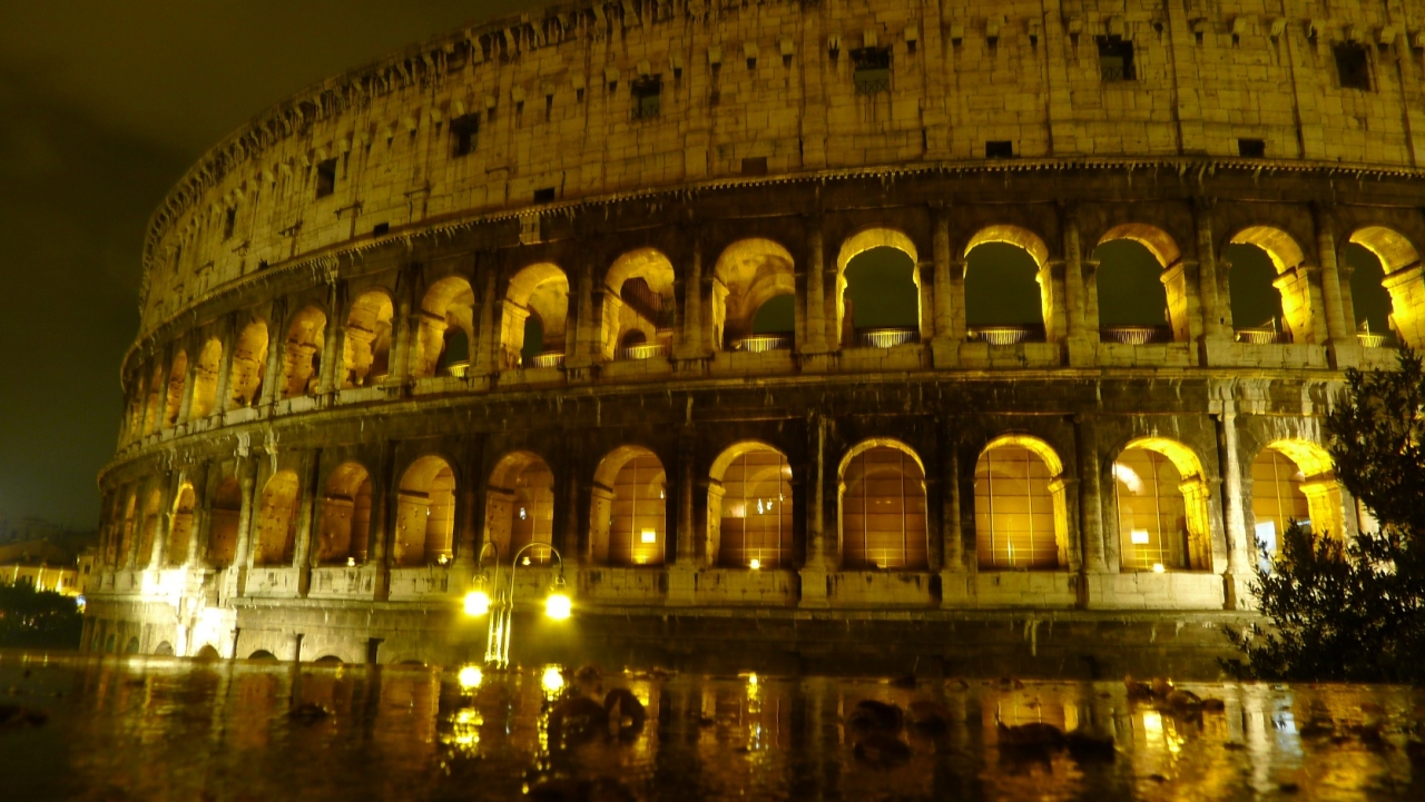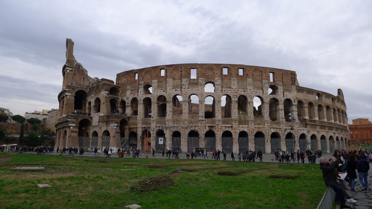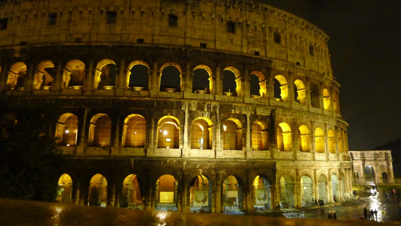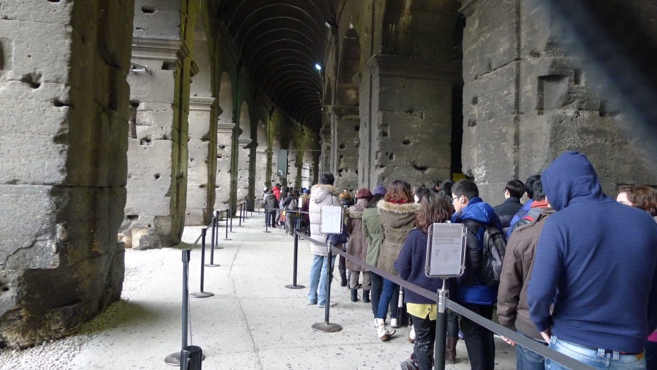 改札を出るともうコロッセオが見えます。なので最初は気軽にライトアップの写真を撮りに行きました。駅を出てすぐ近くの階段を登ったところからは、より良い構図で写すことができます。翌日、改めてお昼過ぎに行ったら長蛇の列にビックリ。私はローマパスを買ってたのでスイスイでしたが、そうでなければ入場をあきらめてたでしょう。
