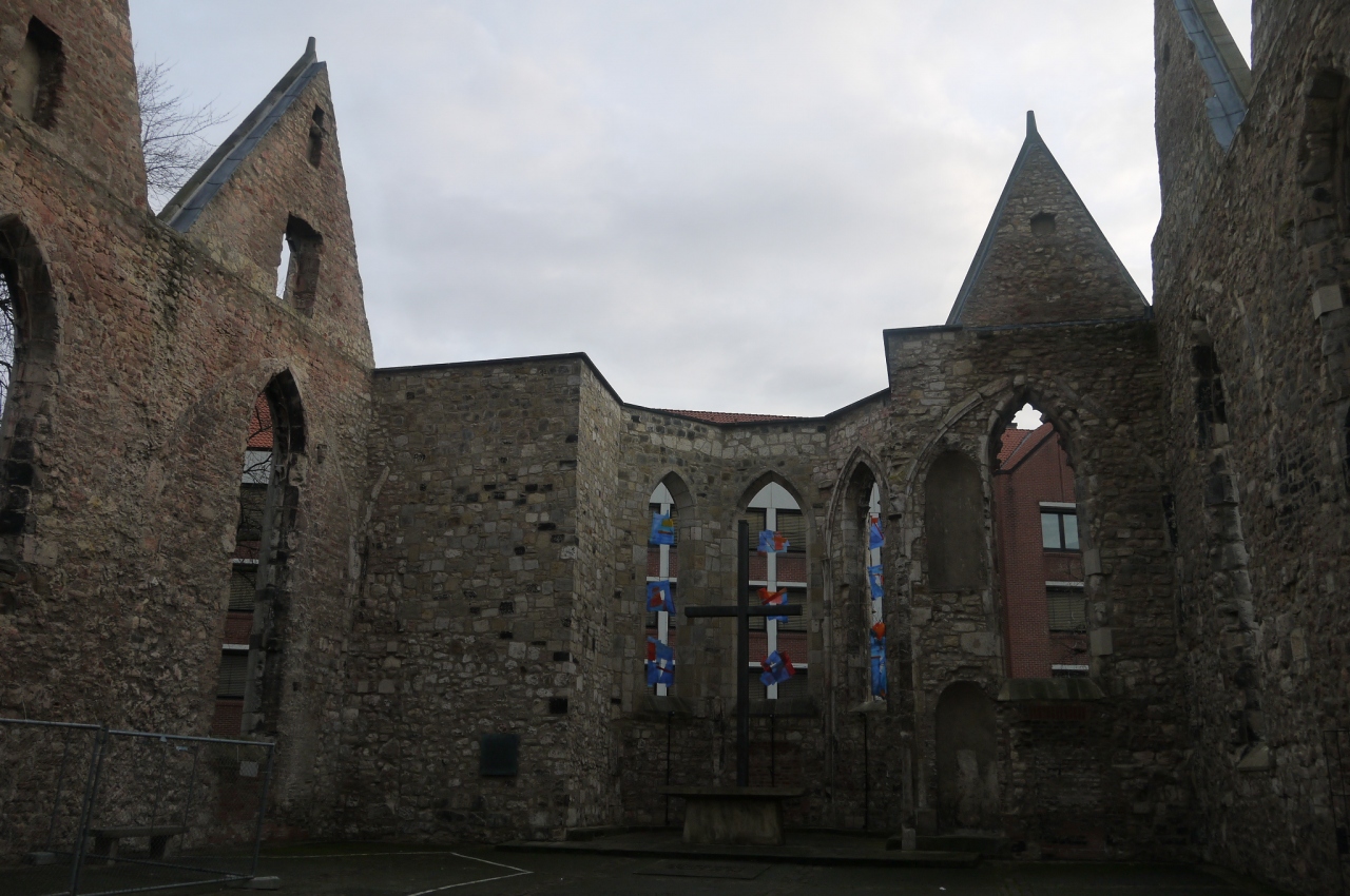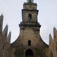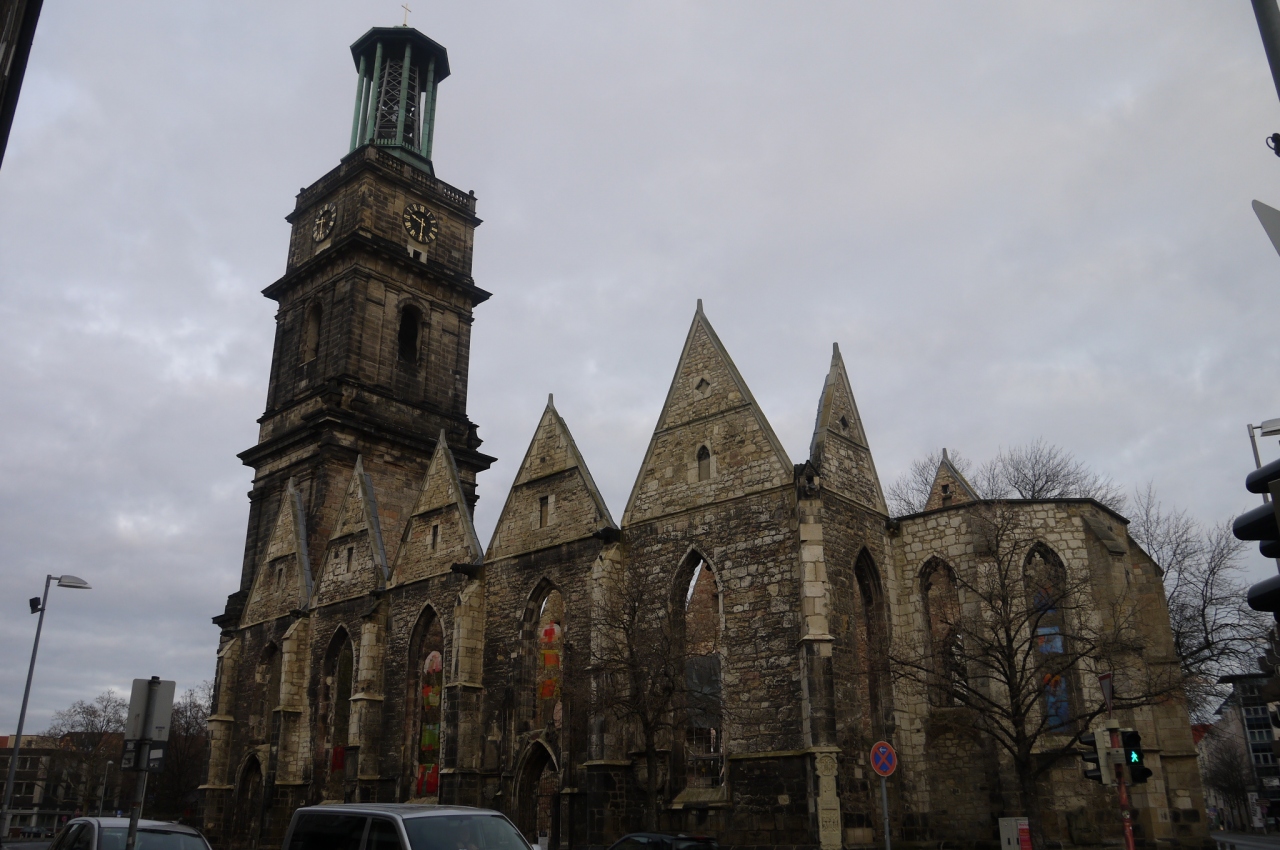 1943年の空襲で被害を受けたのですが、戦争の悲惨さを伝えるために壊されたままの外壁と、再建された塔という姿で保存されています。