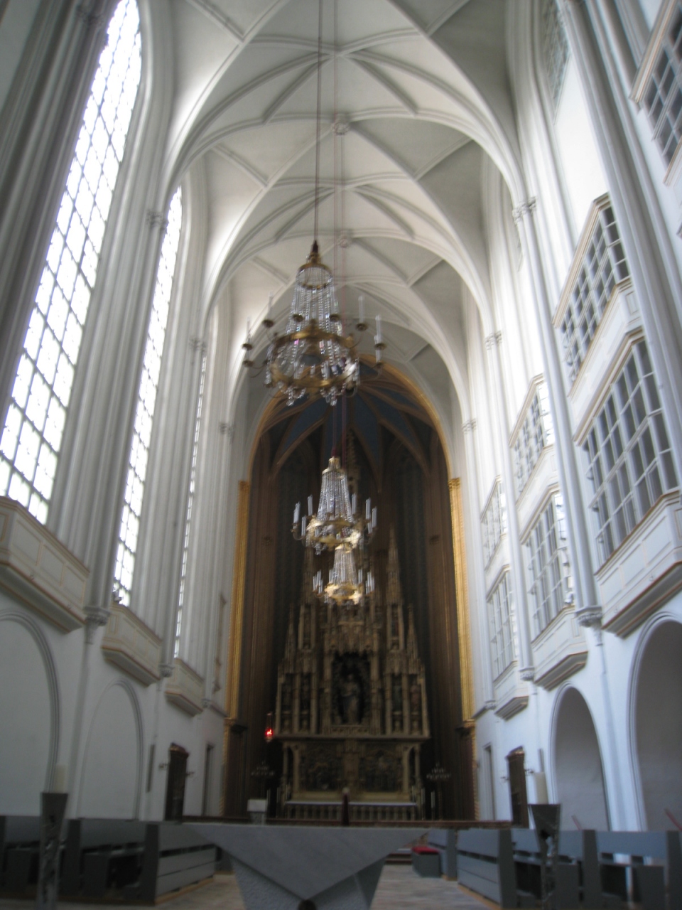 内部は白を基調とし、きれいなアーチ天井やシャンデリア、彫刻、パイプオルガンがあり美しい教会でした。