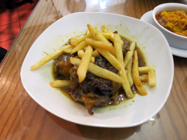 Rabos de Toro(牛テールの煮込み6.80ユーロ)、Callos a la cordobesa(コルドバ風モツ煮込み、タパスとして2ユーロ)を食べました。骨付き肉をナイフフォークで食べるのは難しいですが、おいしいのでぜひ。