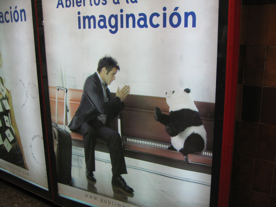 マドリッド市内の移動は地下鉄が便利です。15くらいの路線があって、地図も色分けされていて、乗り換えもそれに従って行います。よく使うので回数券メトロブスが便利です。自動販売機でクレジットカードで購入できます。地下鉄のホームで珍しい看板を見つけました。やはりマドリッドらしいです。