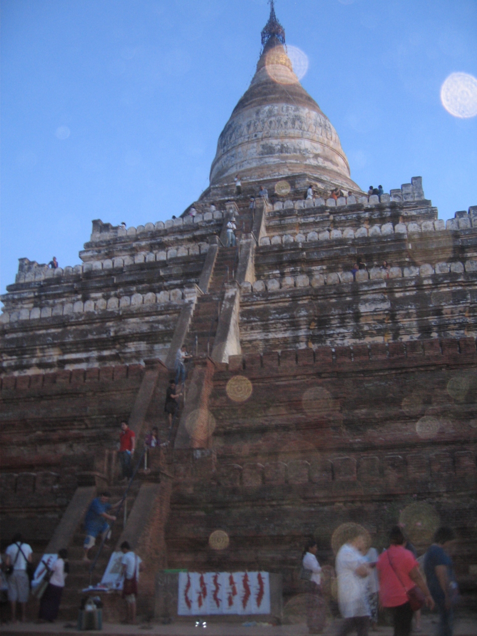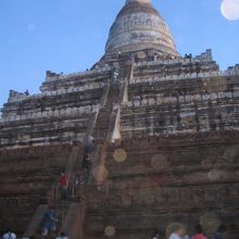 パゴダに登って夕陽を見ることができるということで,観光客がたくさん集まってきます。よい場所でよい写真を撮ろうと思ったなら,早めに場所を確保する必要があります。階段は急なので,気を付けてください。夕陽の沈む方向だけでなく反対側など360度,素晴らしい景色を見ることができます。ぜひ一周してバガンの景色を堪能してください。