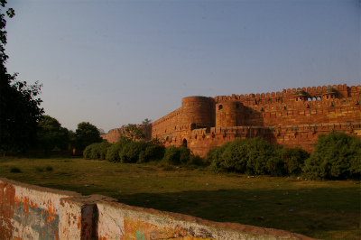 タージマハルからオートリクシャですぐでした。歩いても十分行ける距離だと思います。入り口に荷物預かり所はありました。ココは時間があれば行くという感じで良いと思います。デリーのラールキラーの方が迫力があると思います。