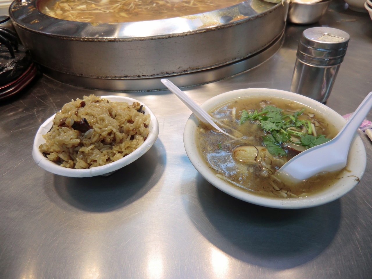 小さい蟹爪がいくつか入ったスープ 干しエビの出汁がきいたおこわ