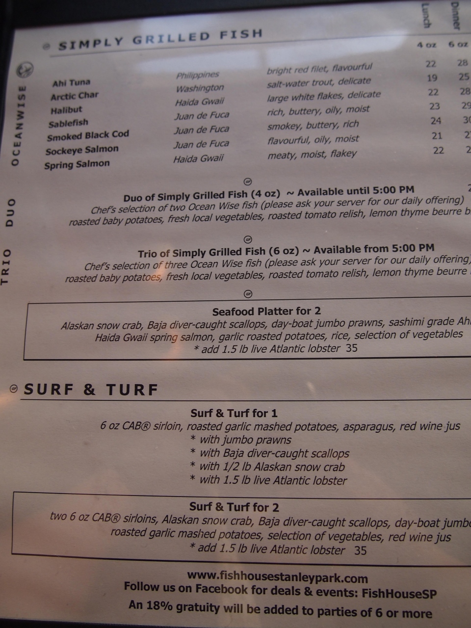 メニューは色々なお魚の料理が種類豊富。 17:00までのランチの時間帯なら、お魚の大きさを4oz, 6ozから選べます。 私は4ozで充分の量でした。