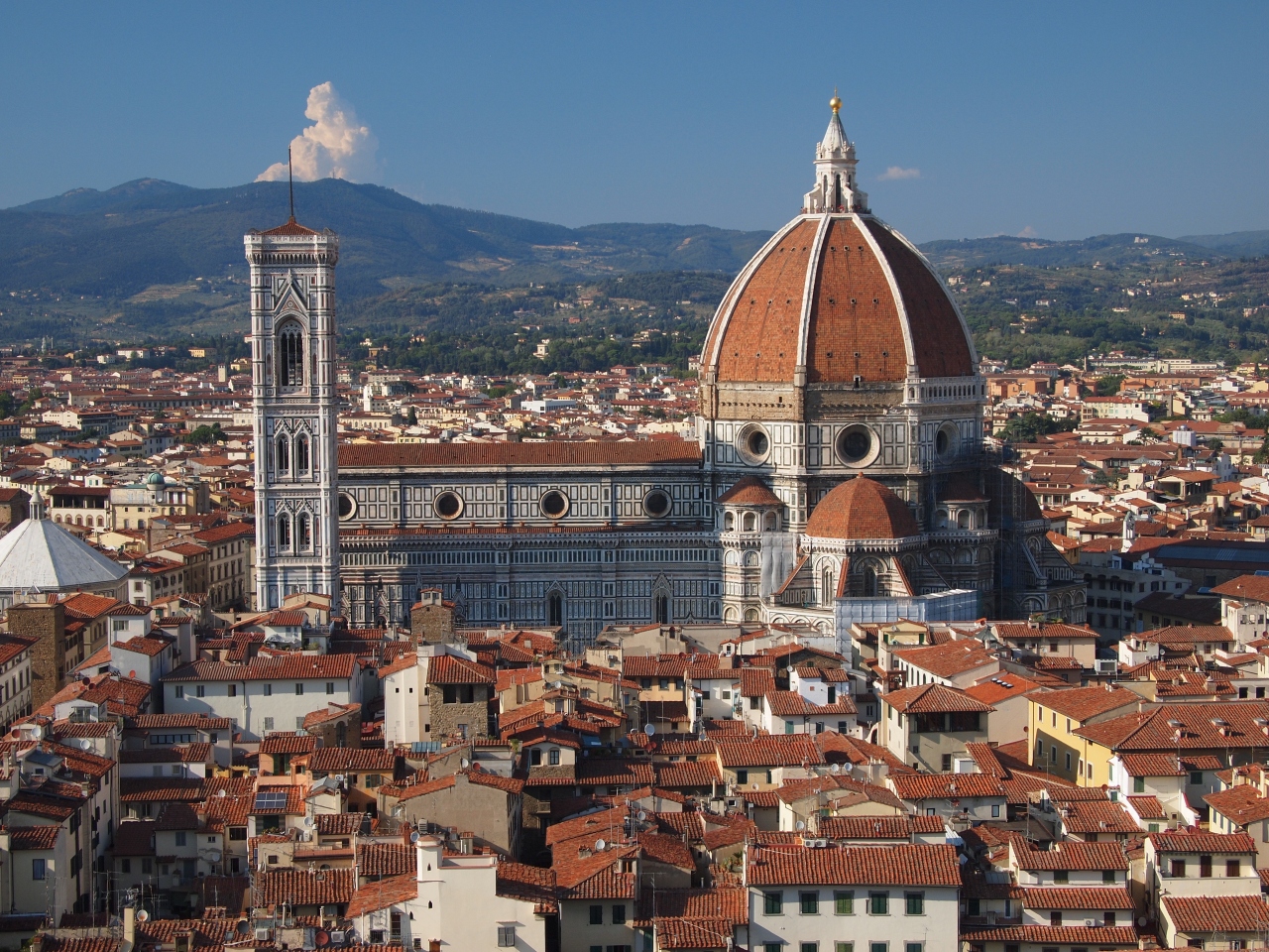 サンタマリア・デル・フィオーレ教会というのがこの教会の正式名称。日本語で言えば、花の聖マリア教会、といったところでしょうか。赤の屋根と白の壁のコントラストが美しく、まさに「花」の名にふさわしい外観。華やかな外観にに比べ、内部は驚く程簡素だが、そのシンプルさが一層、祈りの本質を私たちに教えてくれている気がする。