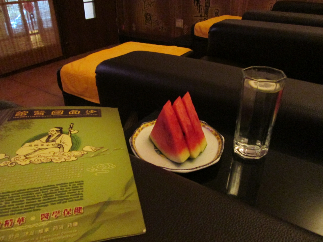 建物に2ヶ所入り口はありますが、右手の中医の受付で「フットマッサージ?」とお願いすると2Fの小部屋に案内されます。脚だけでなく、ボディトリートメントなど数ページにメニューがぎっしり。(ちなみにこの時はフットのみ70分88元/2012年夏現在)