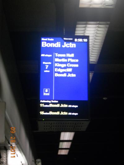 途中、City Hall駅という大きな駅で乗り換え、目的地のKings Cross駅に行くには、ボンダイ・ジャンクション行きに乗り換えるのですが、エスカレーターを降りてちょっと歩きました。 地下深くもぐる感じです。 次の電車があと何分で来るか、とか次の電車はどこ行きかなどが詳しく表示されたので安心して乗る事が出来ました。