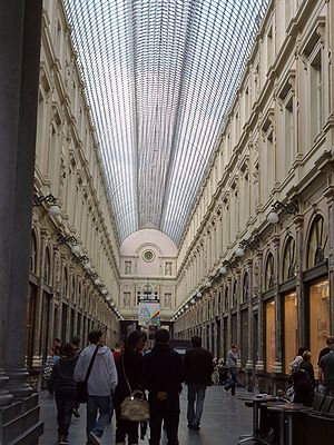 1846年に造られた欧州最古のショッピングアーケードのひとつ。「王」「女王」「王子」と名付けられた3つの通りから成ります。明るい時間 帯であれば、アーケードの天井はガラス製なので、天井から射す光が建物を照らしています。大変美しいショッピングスポットです。全長212mの通りには、チョコレートや本屋などの小売店やお土産屋、カフェ、レストラン等が数多く並んでおり、ゆっくり時間を過ごしたくなるような場所です。