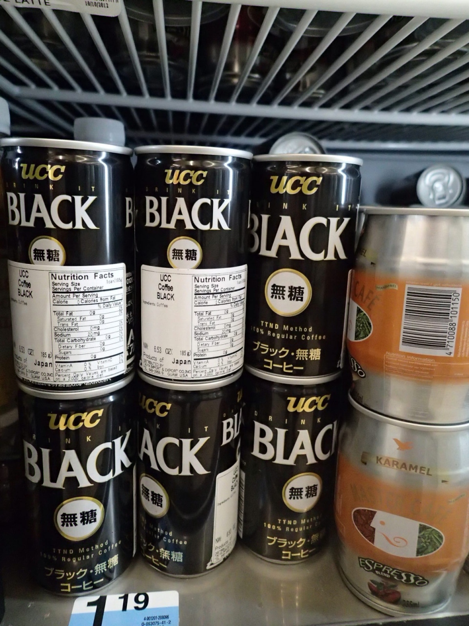 「コーヒーはブラックじゃなきゃイヤ」しかもカフェとか入らずに、気軽に缶コーヒーを飲みたい、常備しておきたい、という面倒くさいあなた(もしくは、あなたの旦那用に)、ぜひここでまとめて調達してしまいましょう。ABCマート(グランドプラザ1階店にて調査)では2.39ドル(低糖)2.79ドル(無糖)で売っていましたが、ここでは1.19ドルと、ドル90円換算で約100円で購入できます。