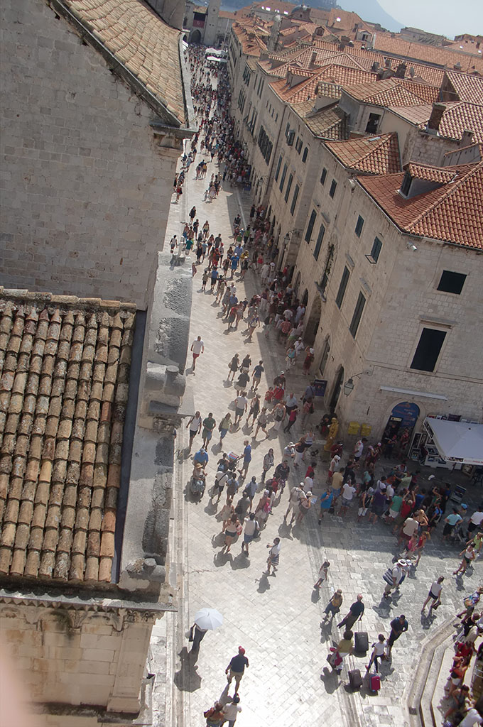 ピレ門を抜けると街を貫くプラッツァ通りに出ます。使い込まれてぴかぴかの敷石がこの街の歴史を物語っています。両脇にはカフェやみやげ物屋等が軒を連ねていて、とてもにぎやか。ドブロブニクに来たんだという思いが高まる素敵な通りです。