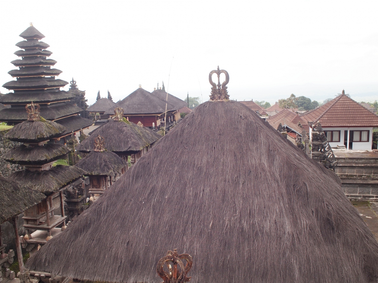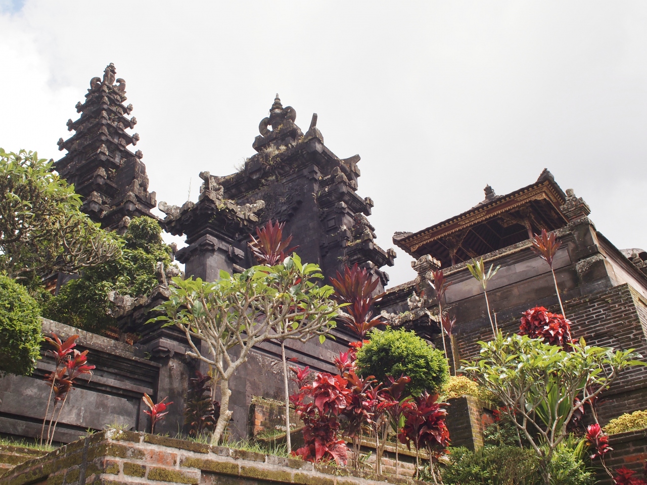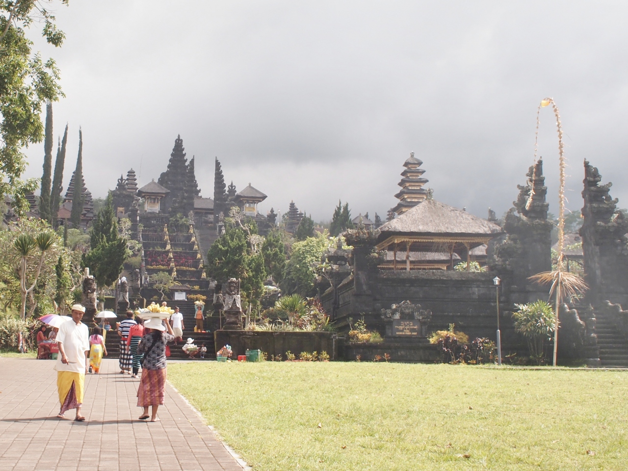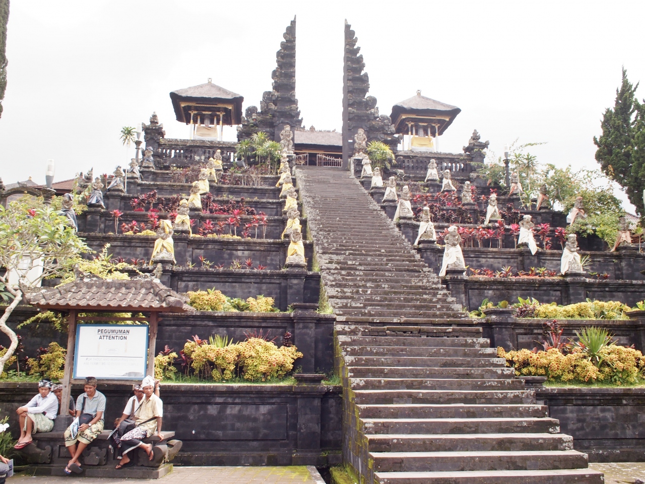 スカスカ・バリの「お寺フリークツアー1」で見学しました。晴れていれば霊峰アグン山が背後に聳え、高所からの見晴らしも絶景だったと思うのですが、雨期のため今にも降りそうな天気でした。乾期でも、午後は曇りがちらしく、寺院観光は午前中、しかも朝の早いうちがいいそうです。地元ガイドの悪名が高いようで、私達のガイドさんも「とにかく無視すること」と何度も念を押しました。最初のサロンを借りるところから一悶着あることも。