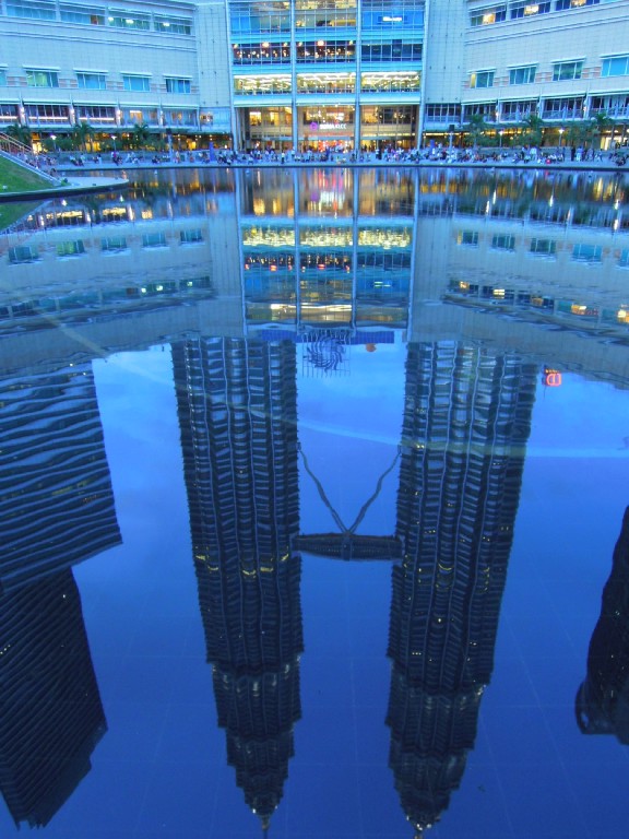 ホテルがKLCCから徒歩10分のコンコルドホテルだったので毎日行きました。朝は正面から見ると逆光でしっとり、昼間は噴水側から見ると太陽を反射して見事、夜間はどちらからも堂々と光輝いています。2012年1月にはただの噴水だったのに2013年1月にはカラーの照明がつきました。
