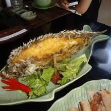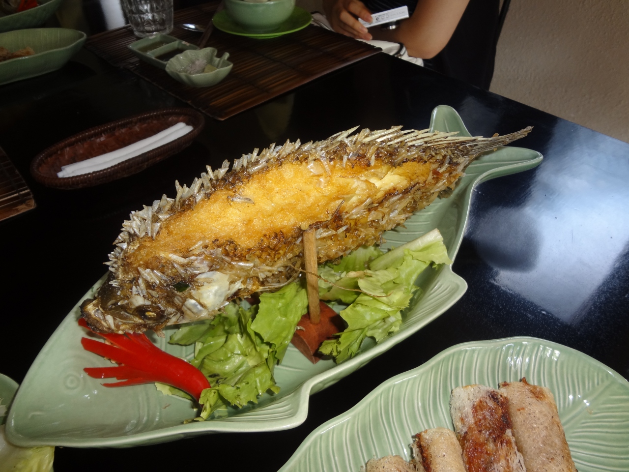 メコン河ツアーでのランチはほとんどがこのお店のようで、日本人を問わず多くの団体客がいました。メニューには名物のエレファントフィッシュが丸々1匹出てきます。ちょっとグロテスクな感じが名物っぽい雰囲気ですが、骨が多く、身もそれ程美味しくはなかった印象です。それにしても生春巻きのライスペーパーが硬くて、なんだか紙を食べてるみたいでした。