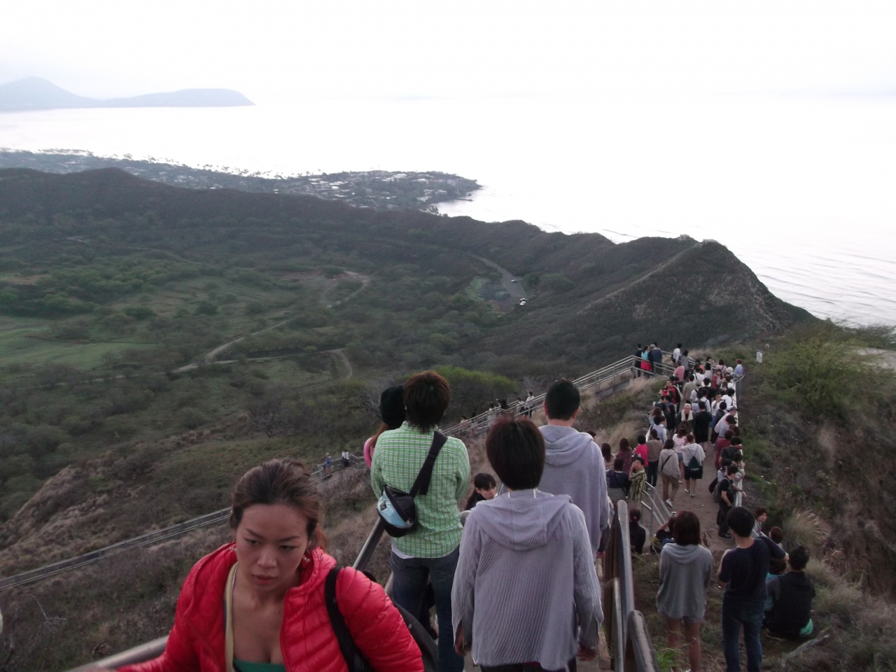 - 7時過ぎが日の出。30分前なら真っ暗。月がないときは懐中電灯が欲しい。昇れば、ワイキキと山側の住宅地の夜景が絶景。日の出のあとも、360度○